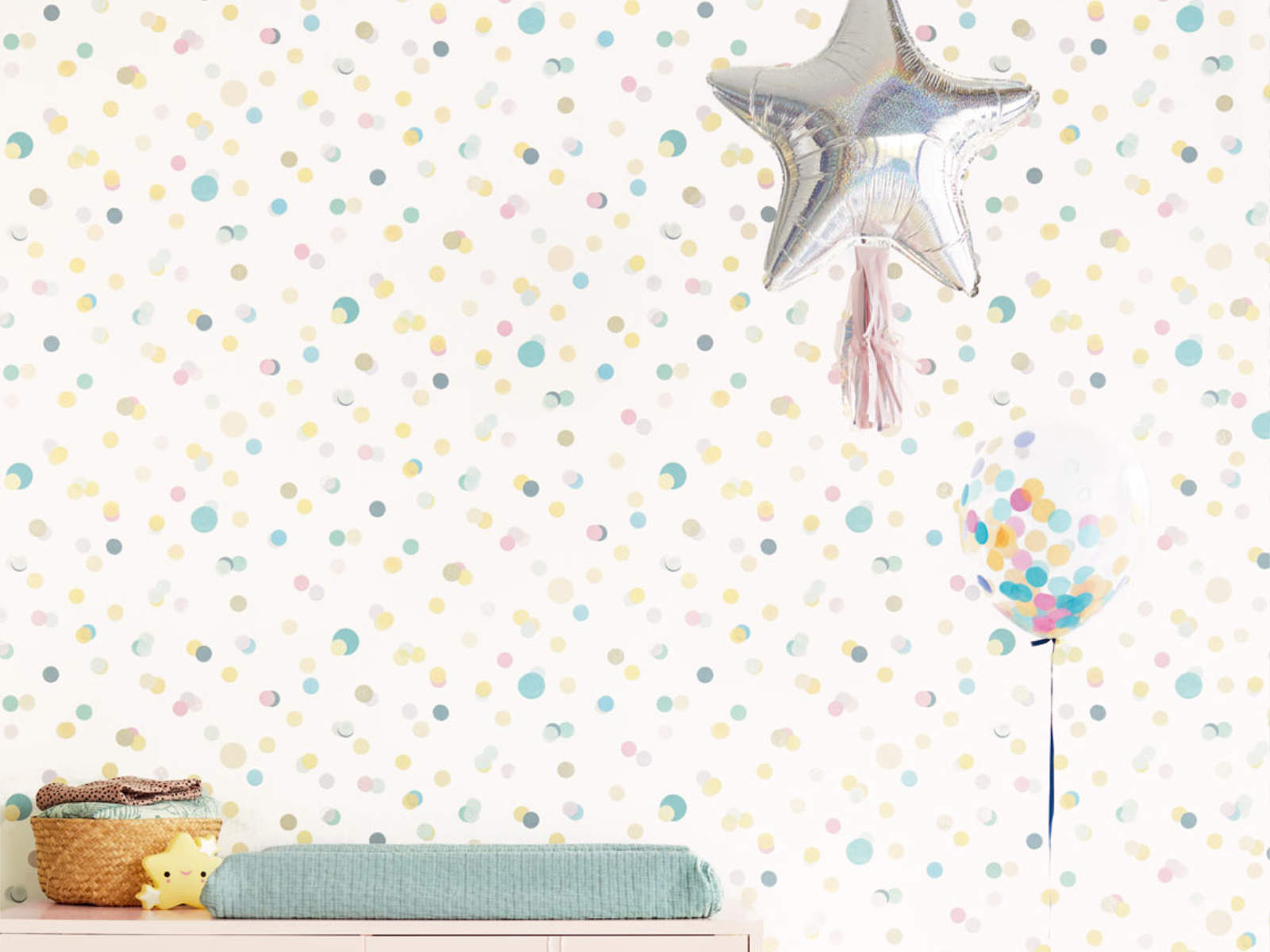 De Mini Me - 399001 van Eijffinger behang is een dessin van kleurrijke confetti die dwarrelt over de muur. Dit dessin is gedrukt op een vliesbehang.