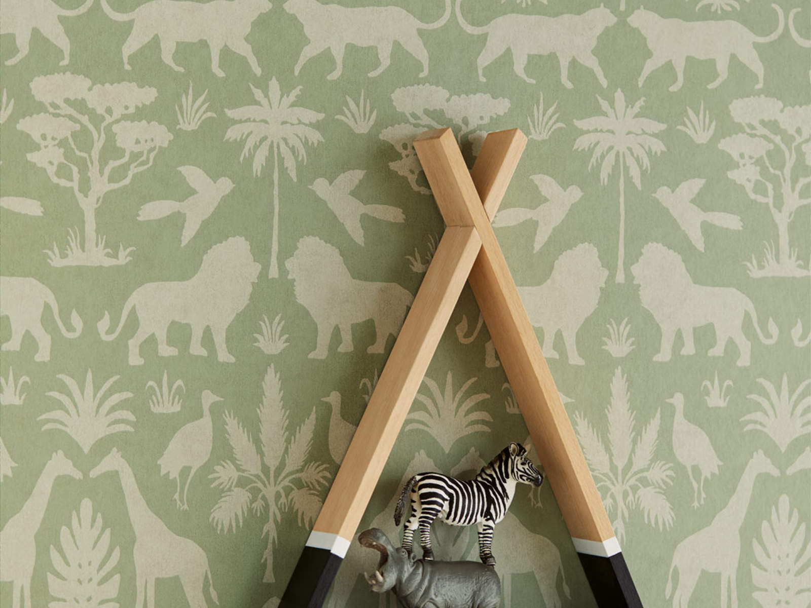 De Mini Me - 399081 van Eijffinger behang is een dessin van geknipte silhouetten van wilde beesten die hun eigen avonturen beleven. Deze muurbekleding is gedrukt op een vliesbehang.
