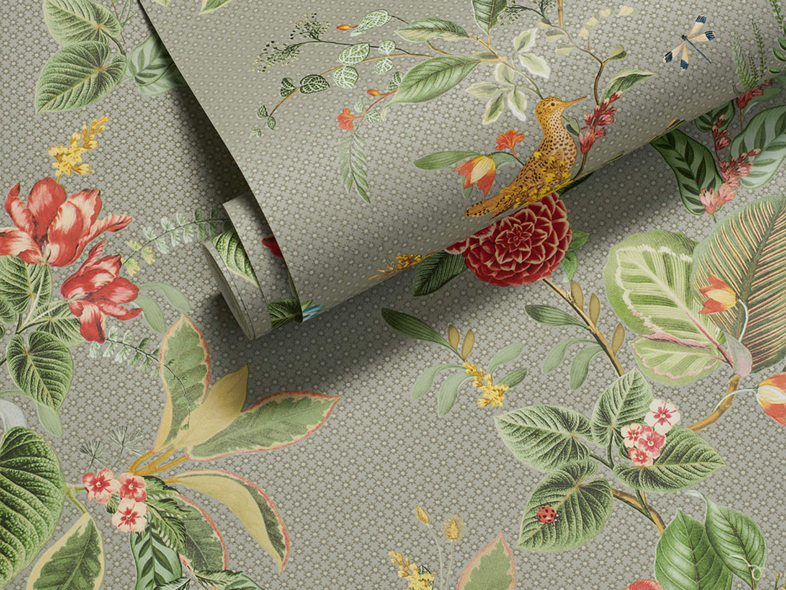 De Pip Studio 5 Floris - 300113 van Eijffinger behang is een opengewerkte jungle bladerprint met grote bloemen, planten en hier en daar een verstopte vogel. In de ondergrond is een klein sterretje in reliëf aangebracht op dit vliesbehang.