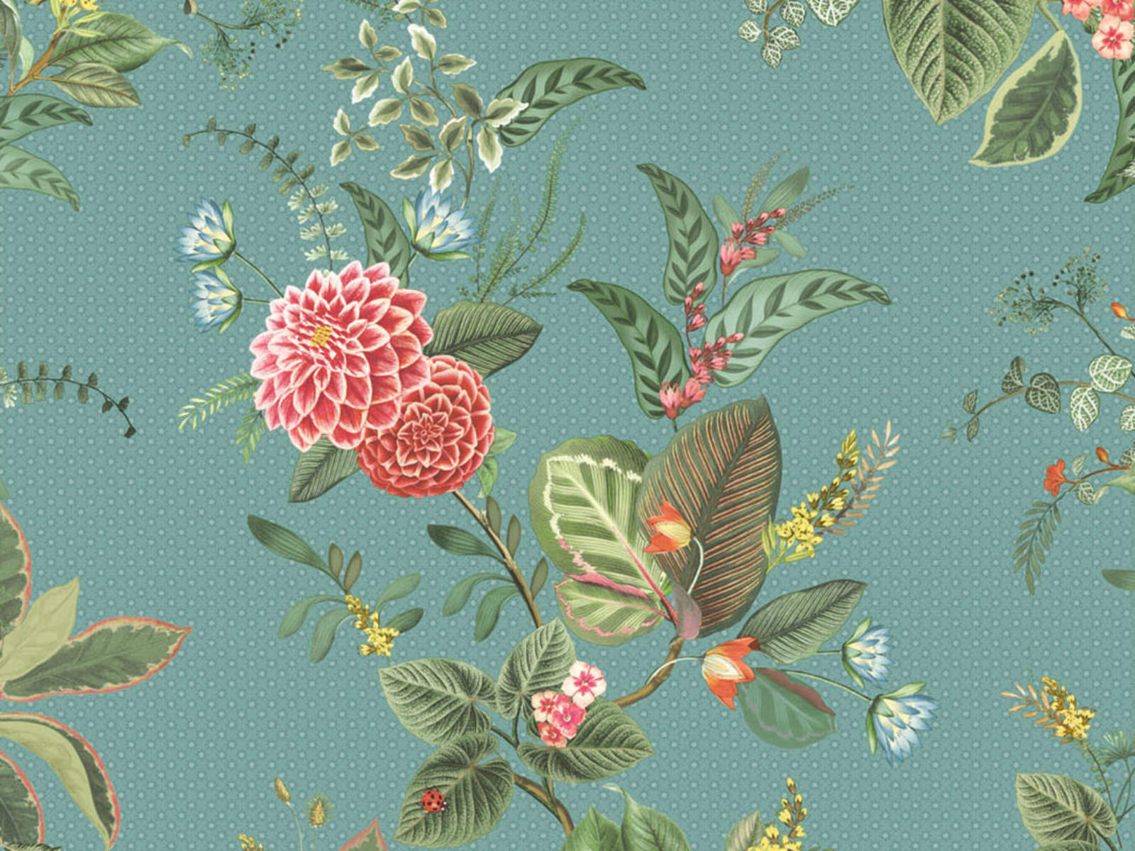 De Pip Studio 5 Floris - 300115 van Eijffinger behang is een opengewerkte jungle bladerprint met grote bloemen, planten en hier en daar een verstopte vogel. In de ondergrond is een klein sterretje in reliëf aangebracht op dit vliesbehang.