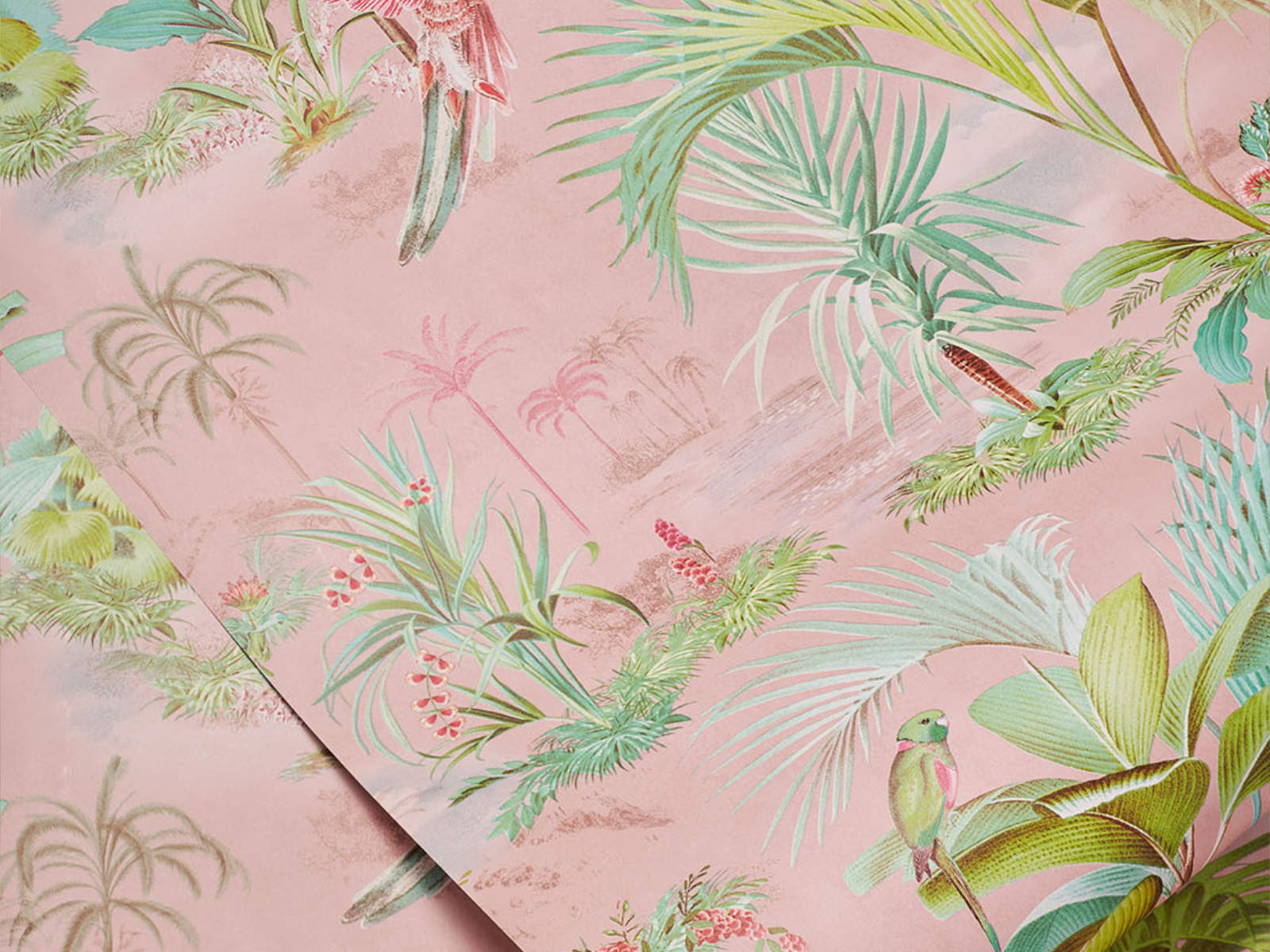 De Pip Studio 5 Palm Scene - 300141 van Eijffinger behang toont een tropische tentoonstelling van rond paraderende paradijsvogels, palmbomen en –bladeren en exotische bloemen. Het tropische tafereel van deze print met water en bergen op de achtergrond heeft een vintage gevoel.