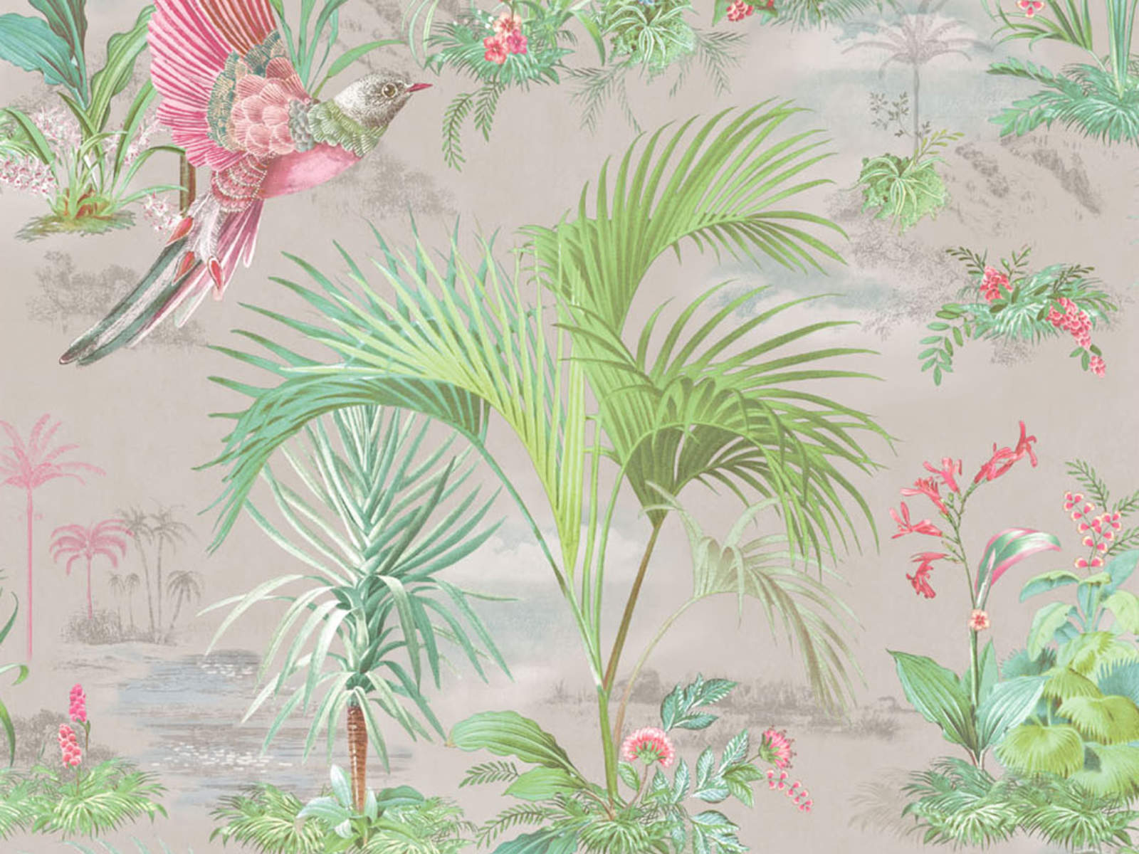De Pip Studio 5 Palm Scene - 300142 van Eijffinger behang toont een tropische tentoonstelling van rond paraderende paradijsvogels, palmbomen en –bladeren en exotische bloemen. Het tropische tafereel van deze print met water en bergen op de achtergrond heeft een vintage gevoel.