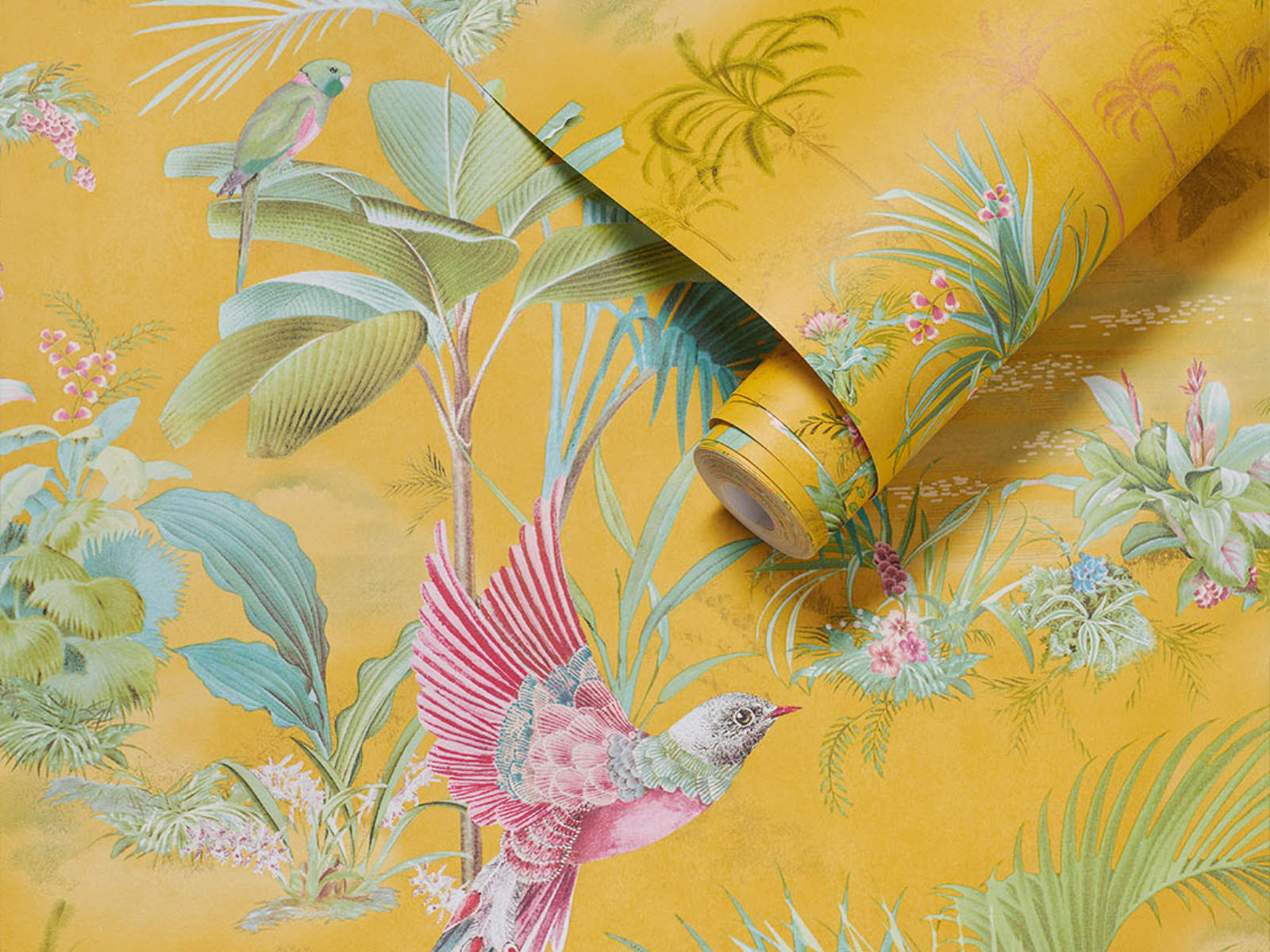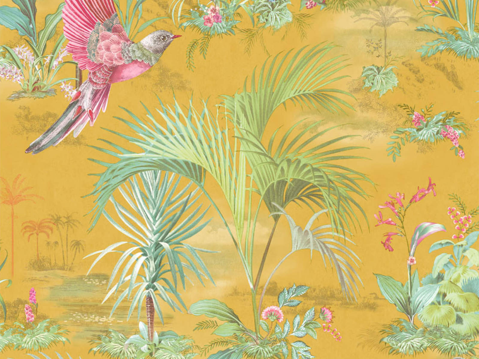 De Pip Studio 5 Palm Scene - 300143 van Eijffinger behang toont een tropische tentoonstelling van rond paraderende paradijsvogels, palmbomen en –bladeren en exotische bloemen. Het tropische tafereel van deze print met water en bergen op de achtergrond heeft een vintage gevoel.