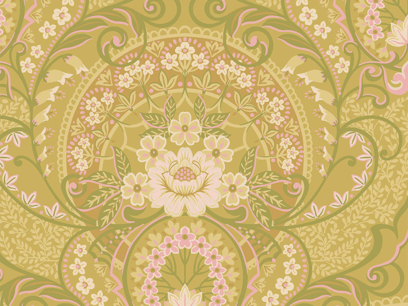 De Posy - 316012 van Eijffinger behang is een dessin van een groots veelkleurig ornament van gezeefdrukte bloemen op een vliesbehang.