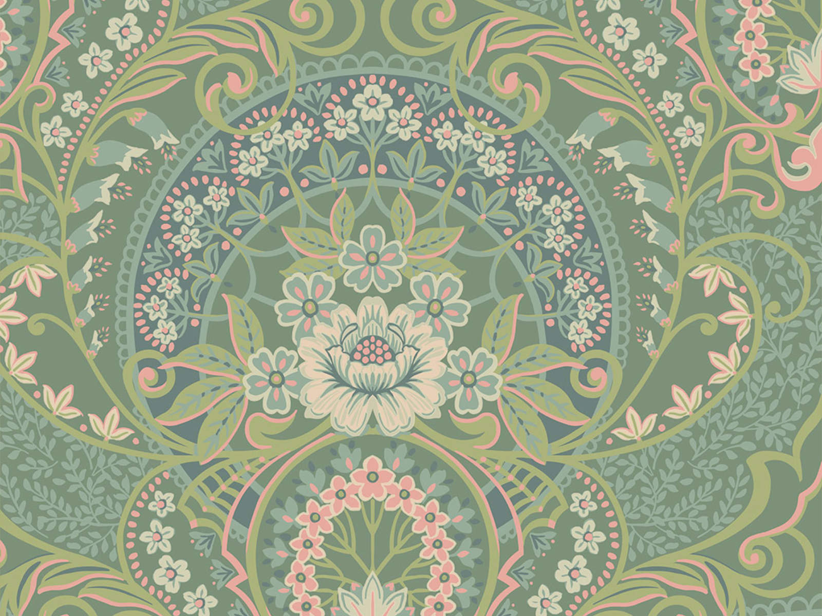 De Posy - 316013 van Eijffinger behang is een dessin van een groots veelkleurig ornament van gezeefdrukte bloemen op een vliesbehang.