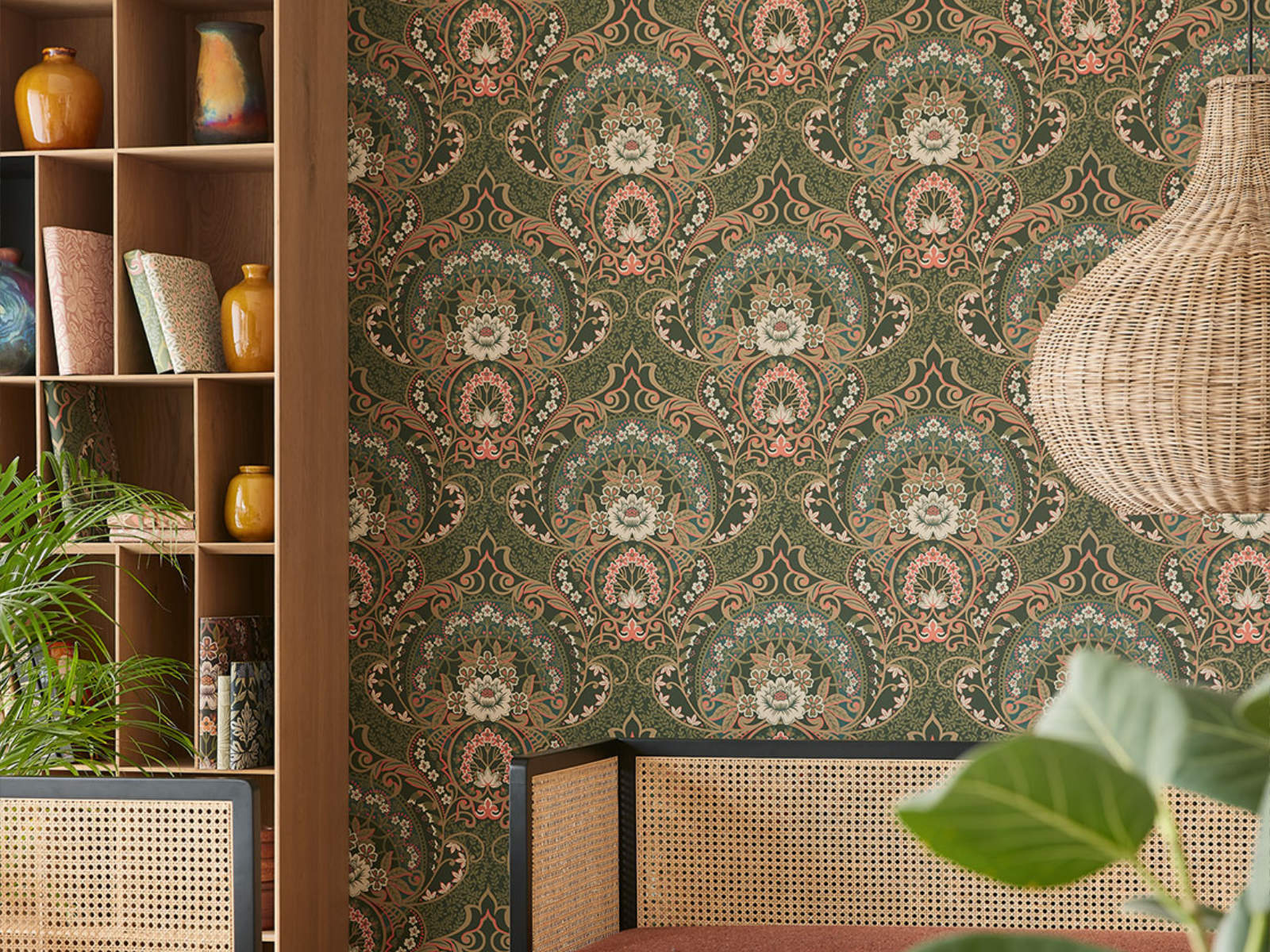 De Posy - 316014 van Eijffinger behang is een dessin van een groots veelkleurig ornament van gezeefdrukte bloemen op een vliesbehang.