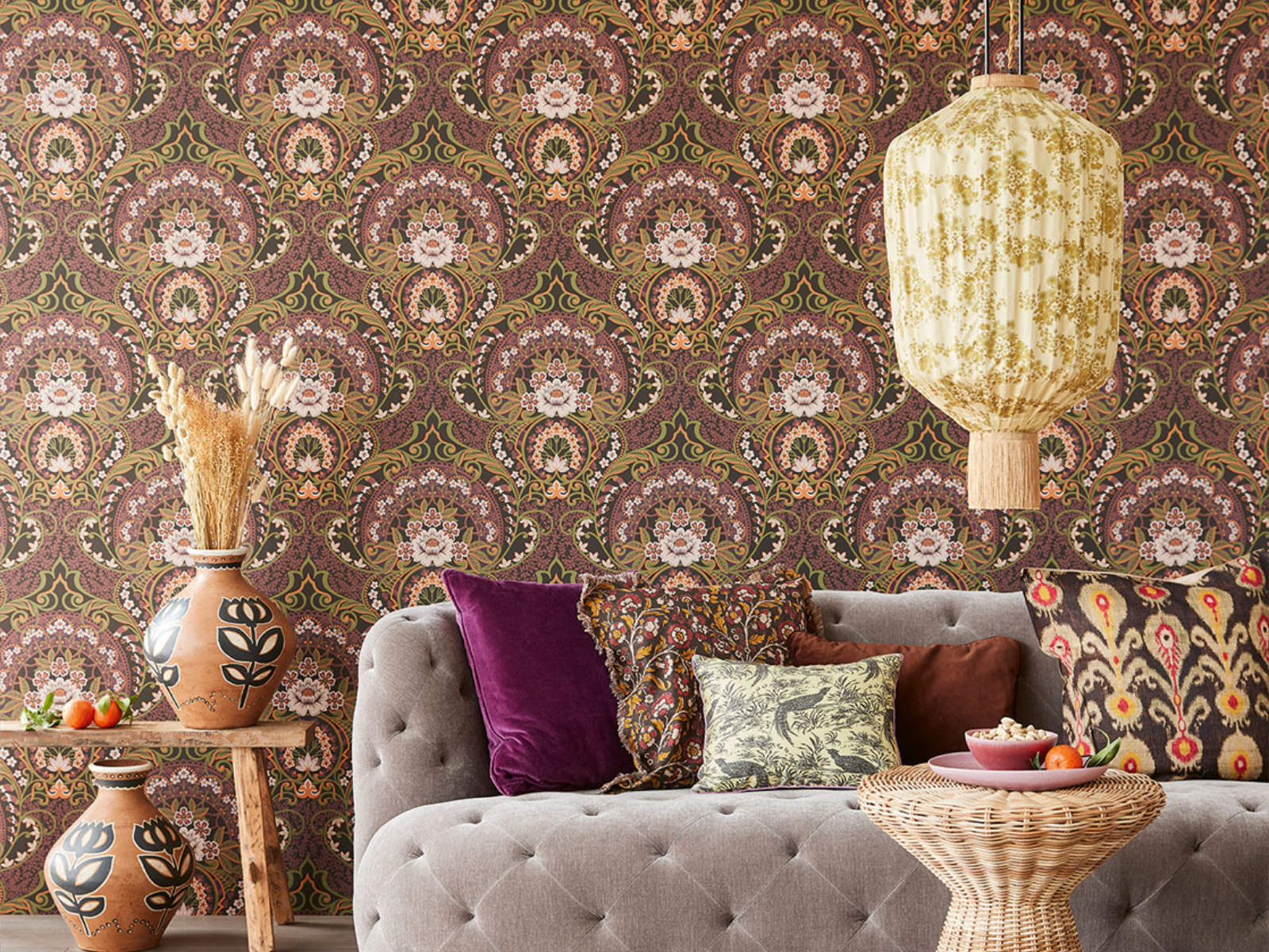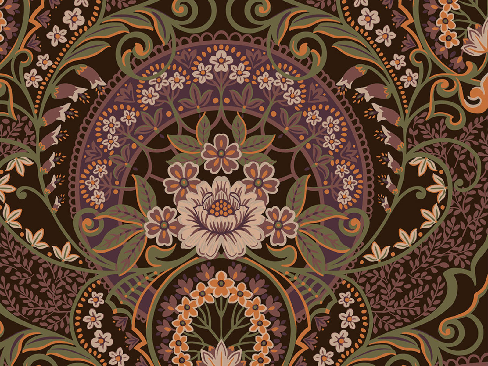 De Posy - 316016 van Eijffinger behang is een dessin van een groots veelkleurig ornament van gezeefdrukte bloemen op een vliesbehang.