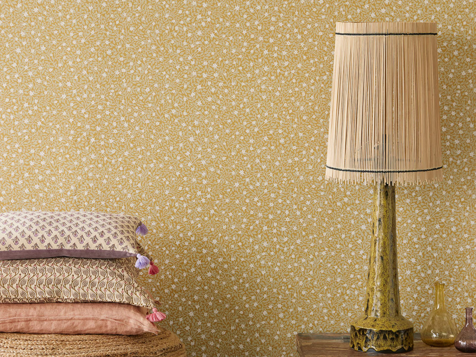 De Posy - 316052 van Eijffinger behang is een dessin van gestrooide stervormige bloemetjes die als lichtpuntjes dansen op de wand.