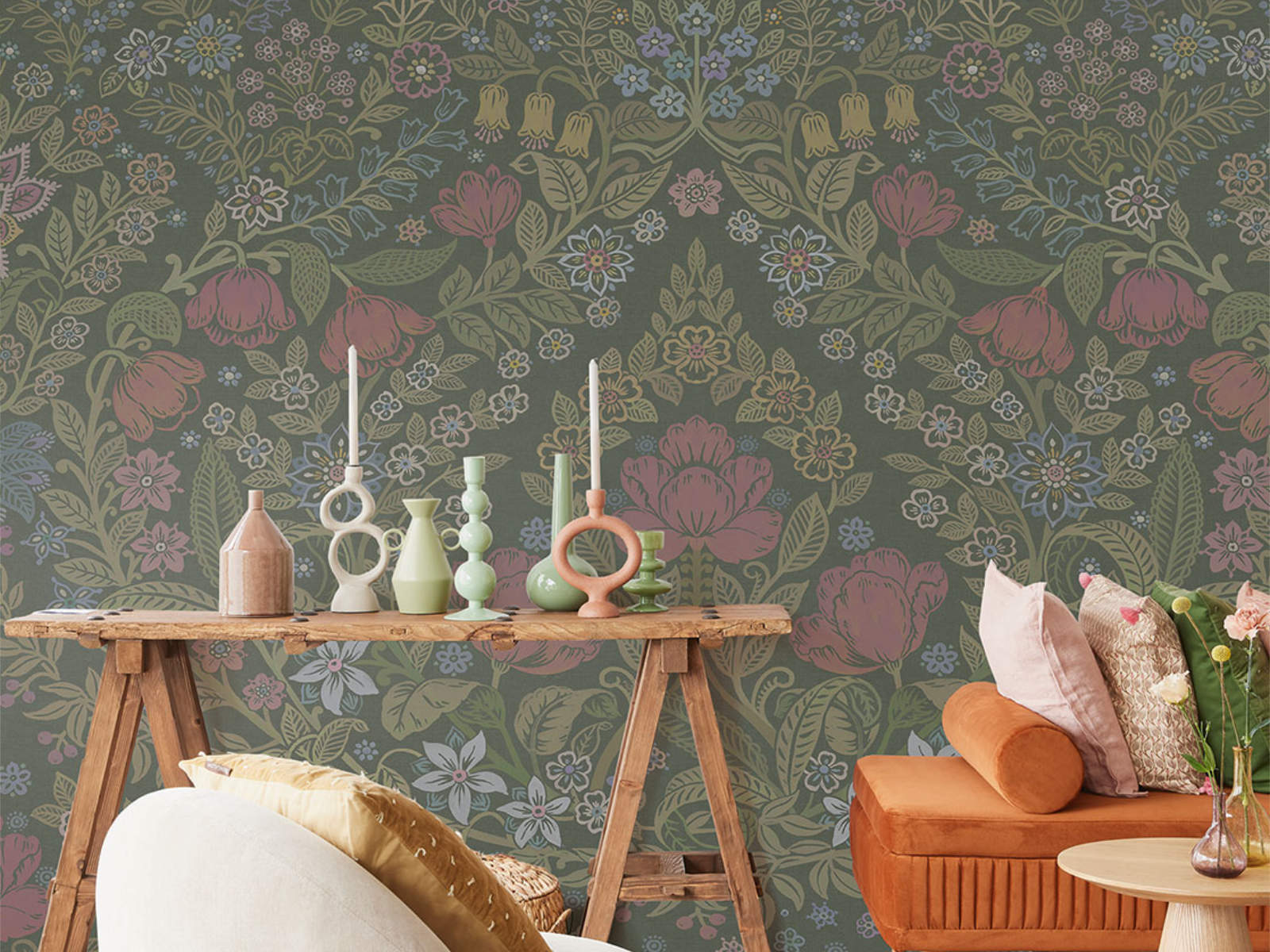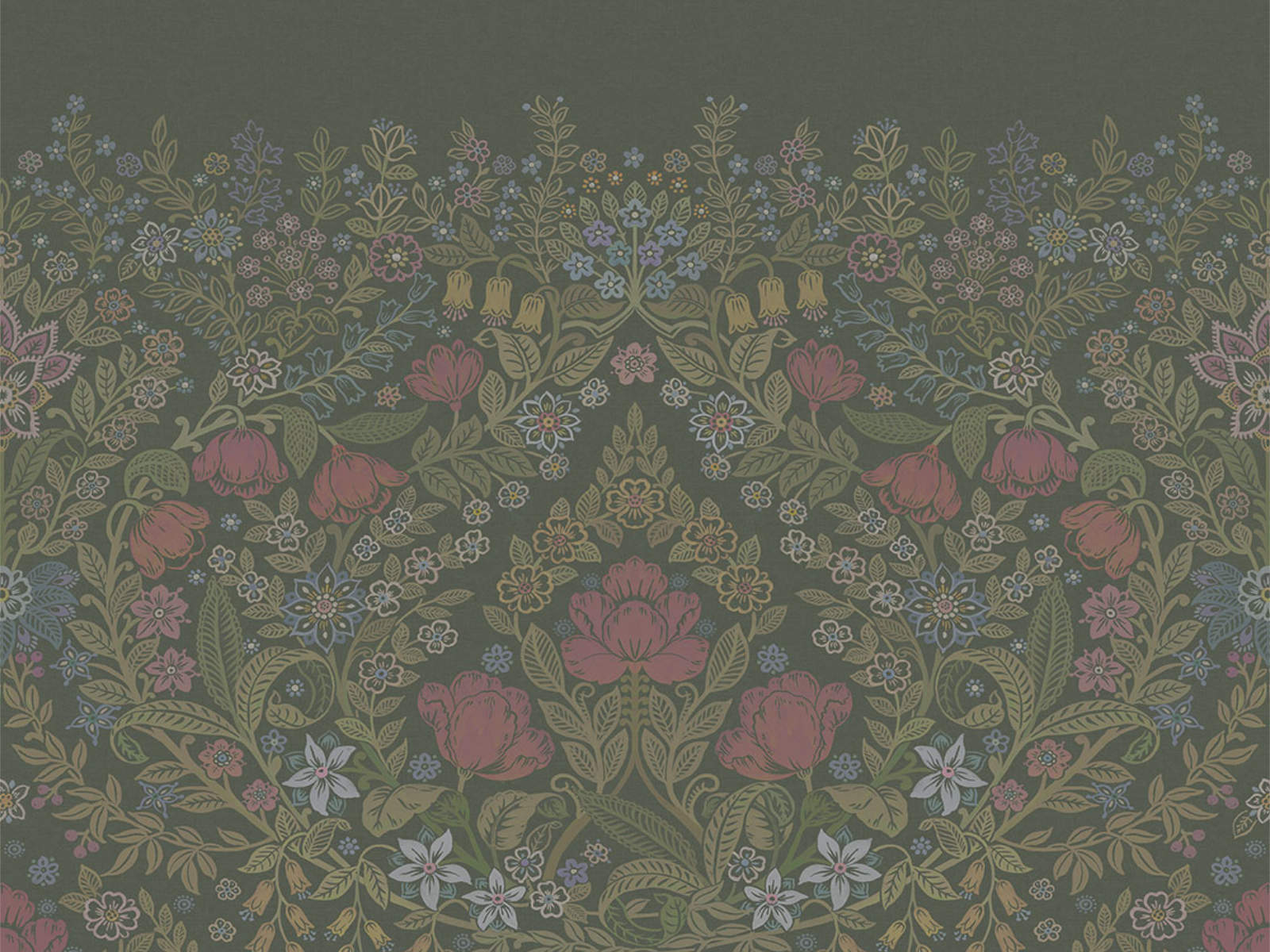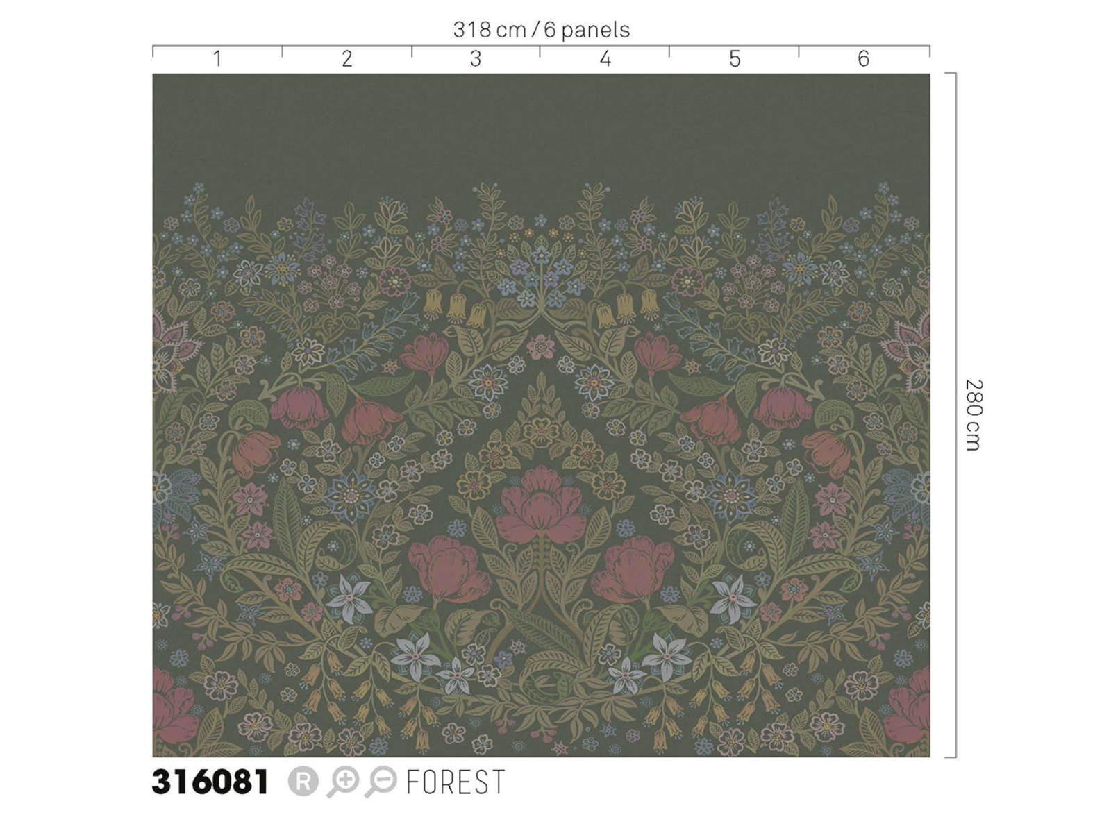 De Posy - 316081 van Eijffinger behang is een paneel (Wallpower) met een folkloristisch patroon in licht pastel of diep donkergroen op een vliesbehang. Dit paneel wordt geleverd met een hoogte van 280 cm x 318 cm breed.