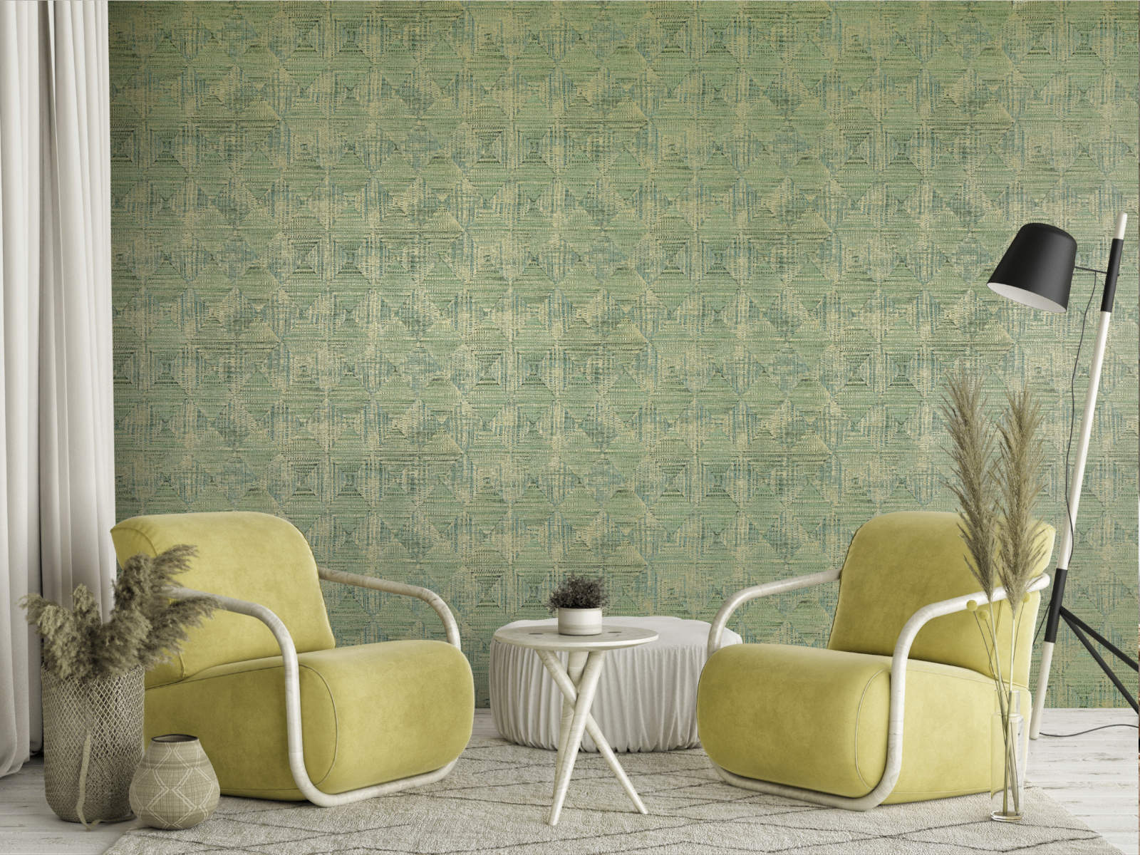 De Liaison Raffia - 46328 van HookedOnWalls is geïnspireerd op het gelijknamige materiaal, dat bekend staat om zijn unieke textuur en natuurlijke uitstraling. Dit dessin heeft een geometrisch patroon en is leverbaar in verschillende kleuren.