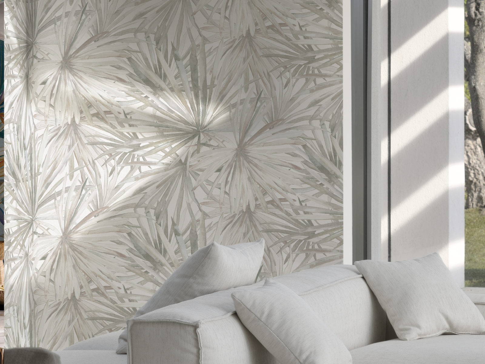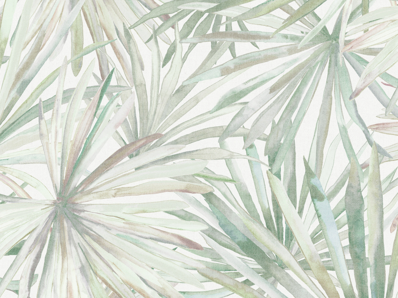 Zin in een fris, tropisch accent aan je muur? Met Corifa uit de Promenade collectie van HookedOnWalls geef je je interieur een luchtige botanische touch. Het patroon toont een speels spel van palmbladeren die willekeurig over elkaar lijken te liggen. De verspringende aanzet zorgt voor een natuurlijke herhaling zonder strakke lijnen, wat het geheel een los en levendig karakter geeft.