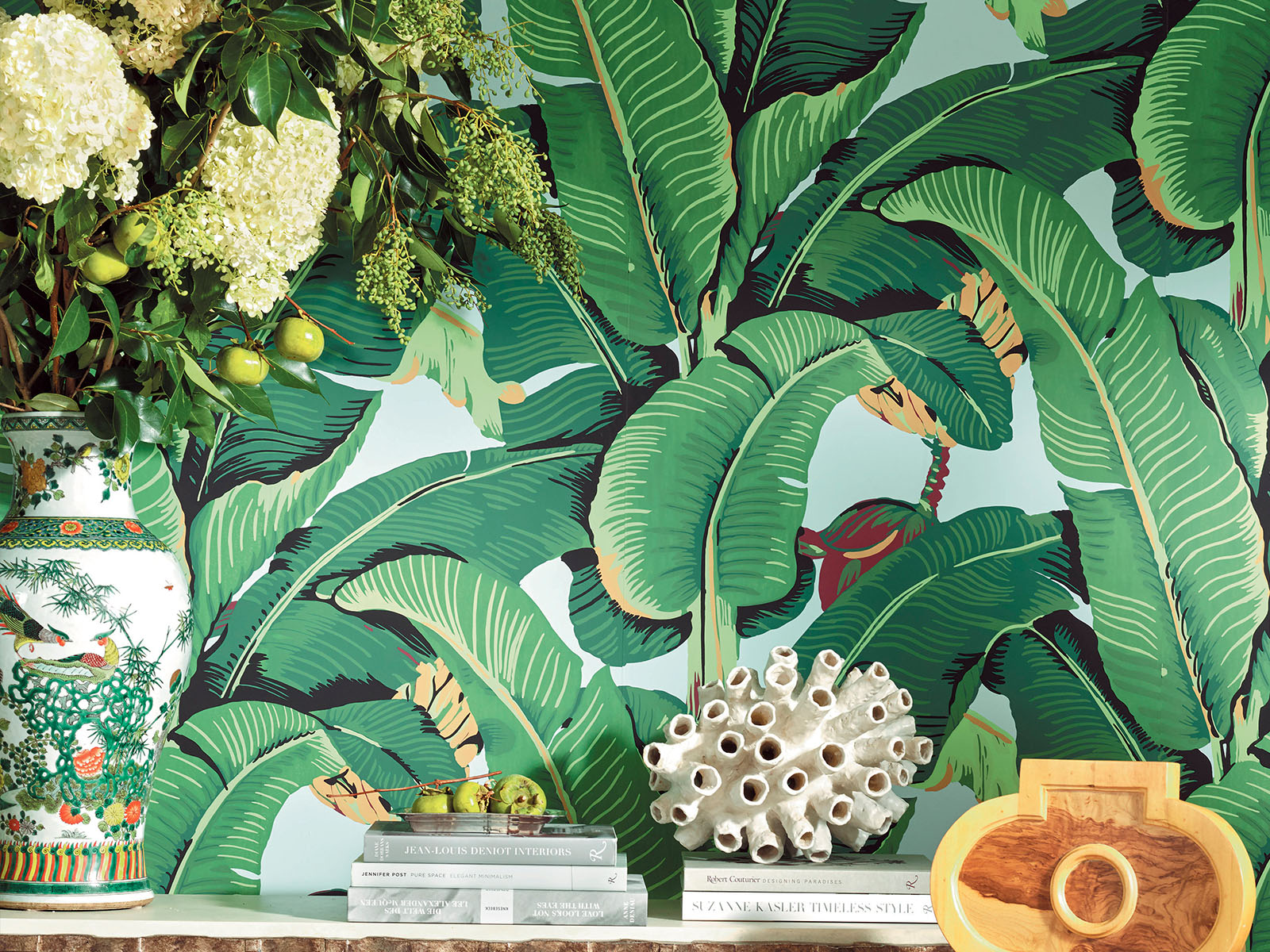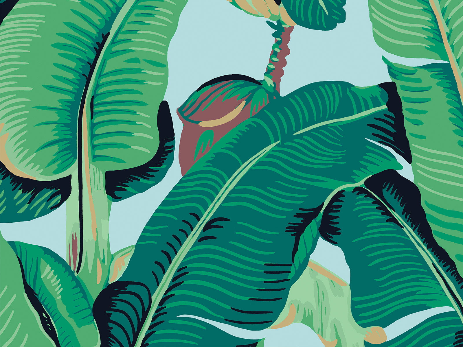 Hindson Palm brengt instant tropische flair in je interieur met zijn krachtige bladerpatroon en rijke kleurenpalet. Dit iconische behang uit de Scalamandré collectie van HookedOnWalls toont grote, expressieve bananenbladeren die een levendige, bijna weelderige sfeer oproepen. Het ontwerp is energiek en dominant, perfect voor wie een tropisch statement durft te maken in bijvoorbeeld de hal, eetkamer of woonkamer.