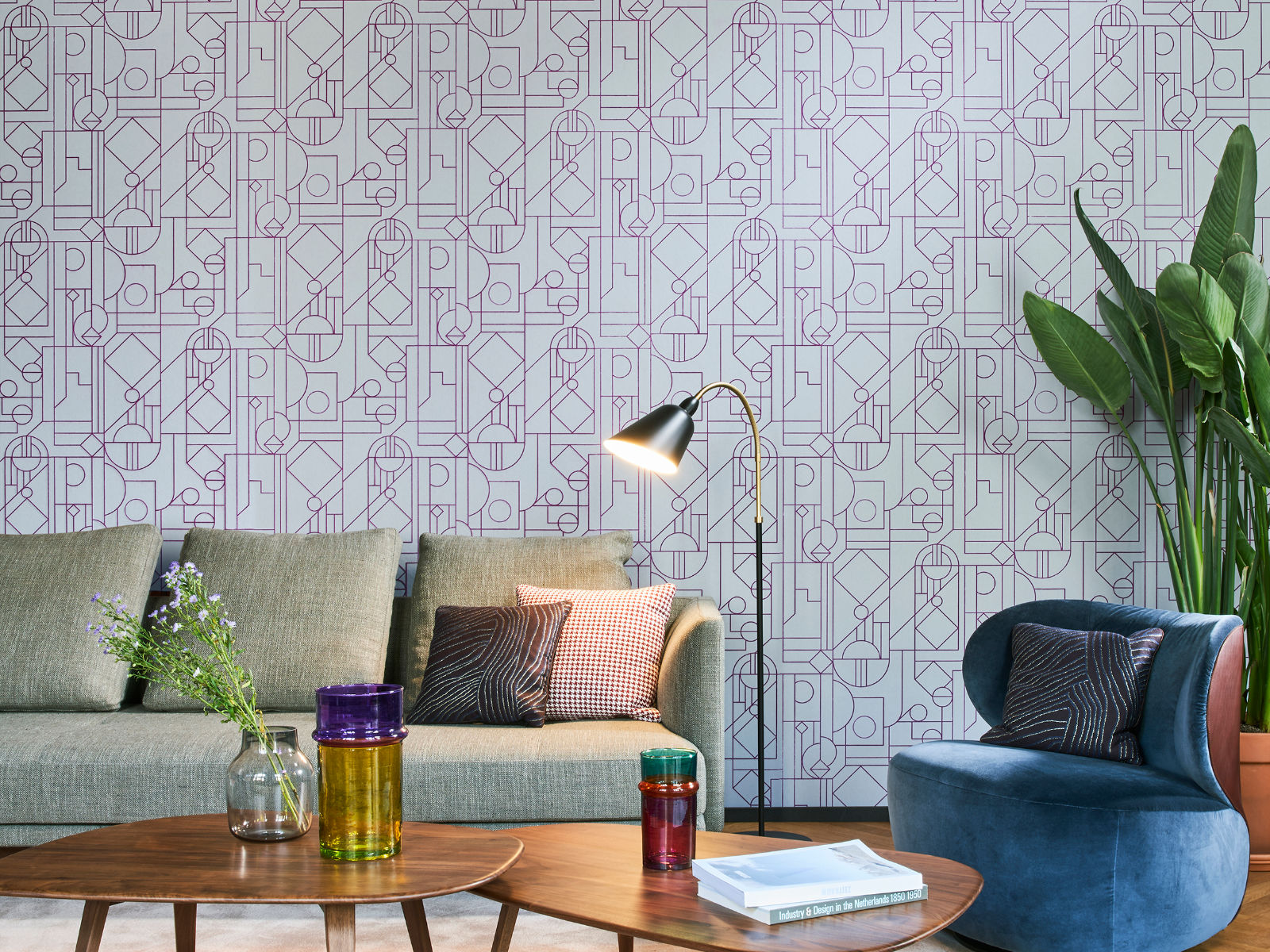 De Tinted Tiles Lush - 29014 van HookedOnWalls bestaat uit geometrische figuren, cirkels en driehoeken die een een intrigerend schouwspel vormen waar je niet snel door verveeld raakt. Een dessin met een twist, dat duidelijk enige inspiratie vond in het Art Deco tijdperk. Een aantal van de kleuren zijn afgewerkt met velvet voor een extra luxegevoel.