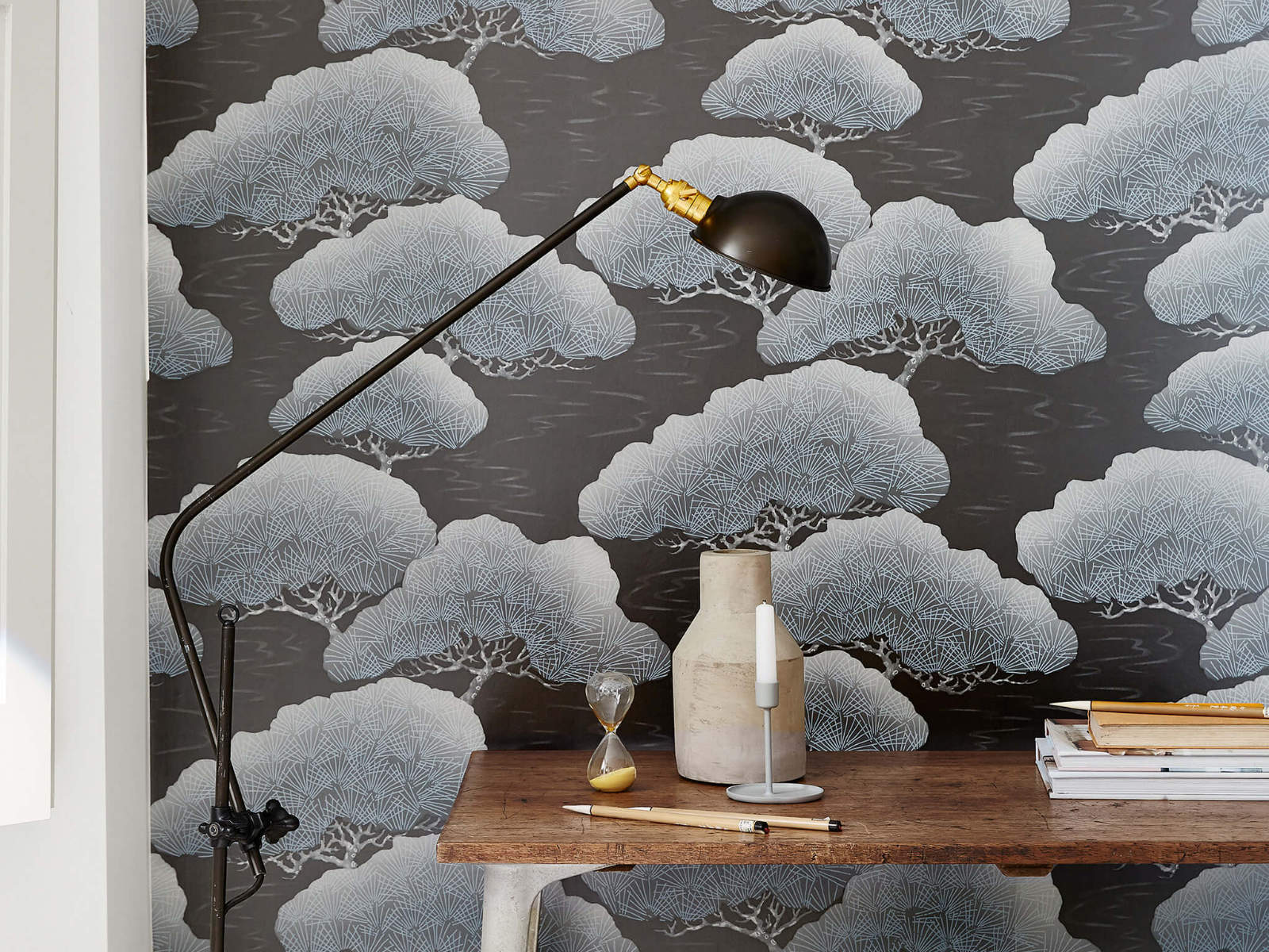 De 20th Century Papers Pines - Ash Pine van Little Greene is geïnspireerd op een 19de-eeuwse zijden kimono, waarop een abstracte tekening van pijnbomen gecombineerd wordt met zachte wolken. Het Pines behang is meer dan muurbekleding; het is een kunstwerk dat de elegantie van de natuur naar binnen brengt. De abstracte tekening van de pijnbomen, samen met de zachte wolken, creëert een sfeer van rust en sereniteit in elke kamer.