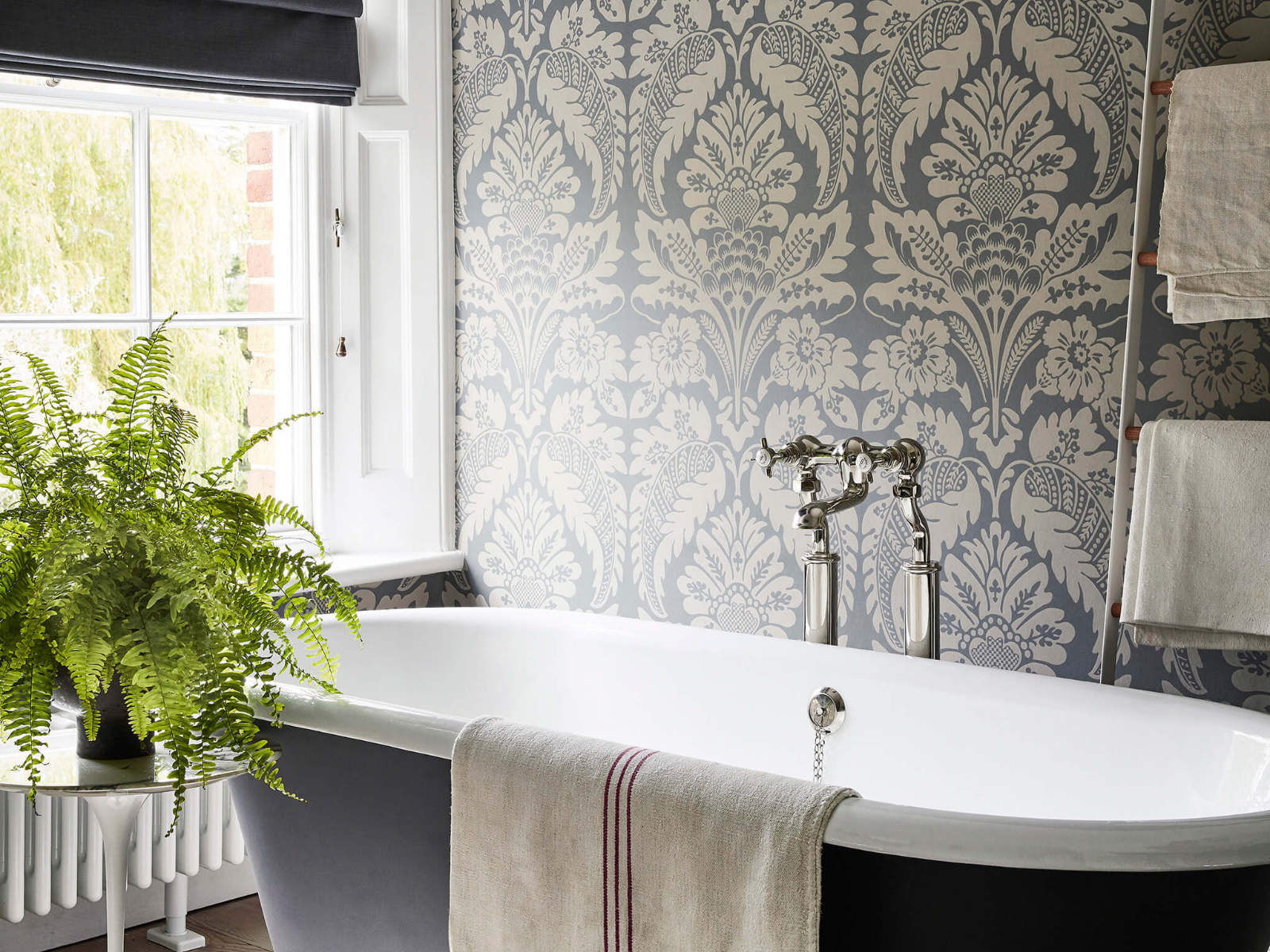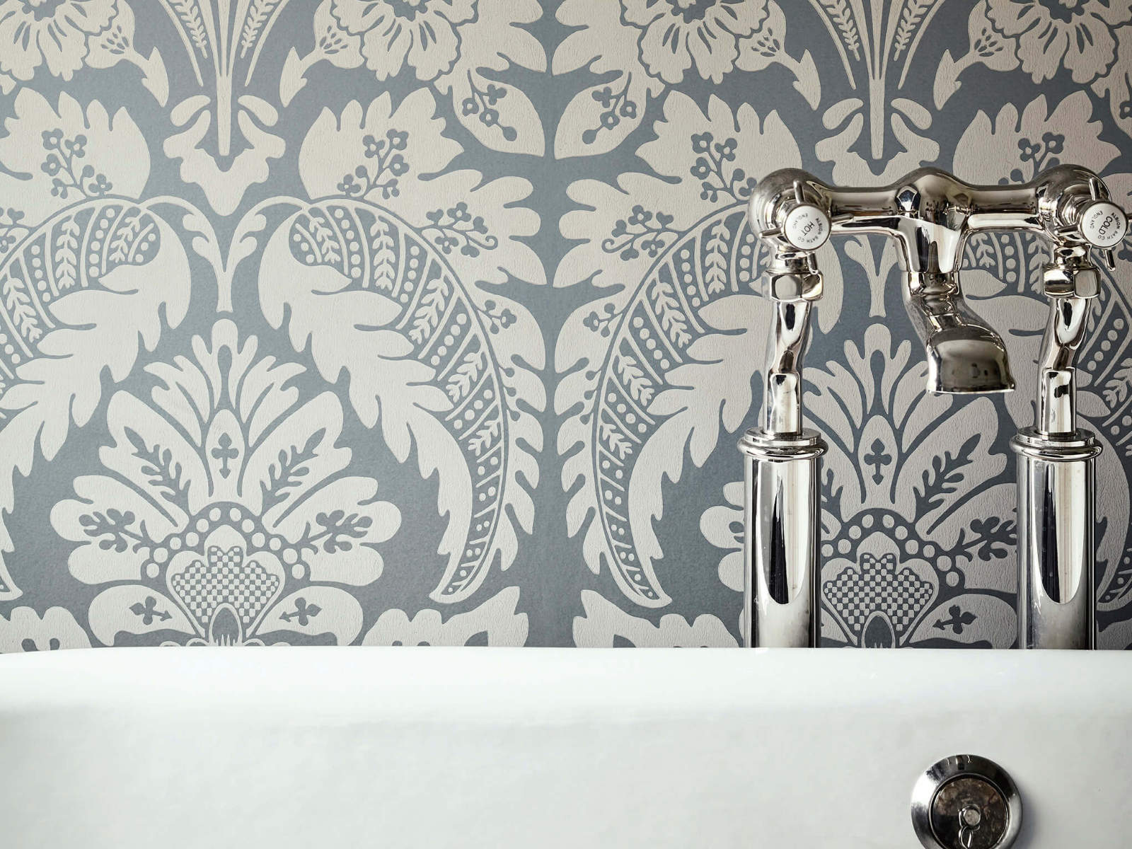 De London Wallpapers V Wilton - Pad van Little Greene is een tijdloze schoonheid die de grandeur van de 18e eeuw naar de moderne tijd brengt. Dit damastontwerp, geïnspireerd op de grootschalige granaatappelpatronen uit het midden van de 18e eeuw, ademt een gevoel van luxe en elegantie. Dit behang, ooit een pronkstuk in een groots Engels huis, roept de sfeer op van vervlogen tijden waarin gevlokt behang een symbool was van weelde en sociale status. Een imitatie van duur textiel was gevlokt behang destijds een overtuigend statement van rijkdom.