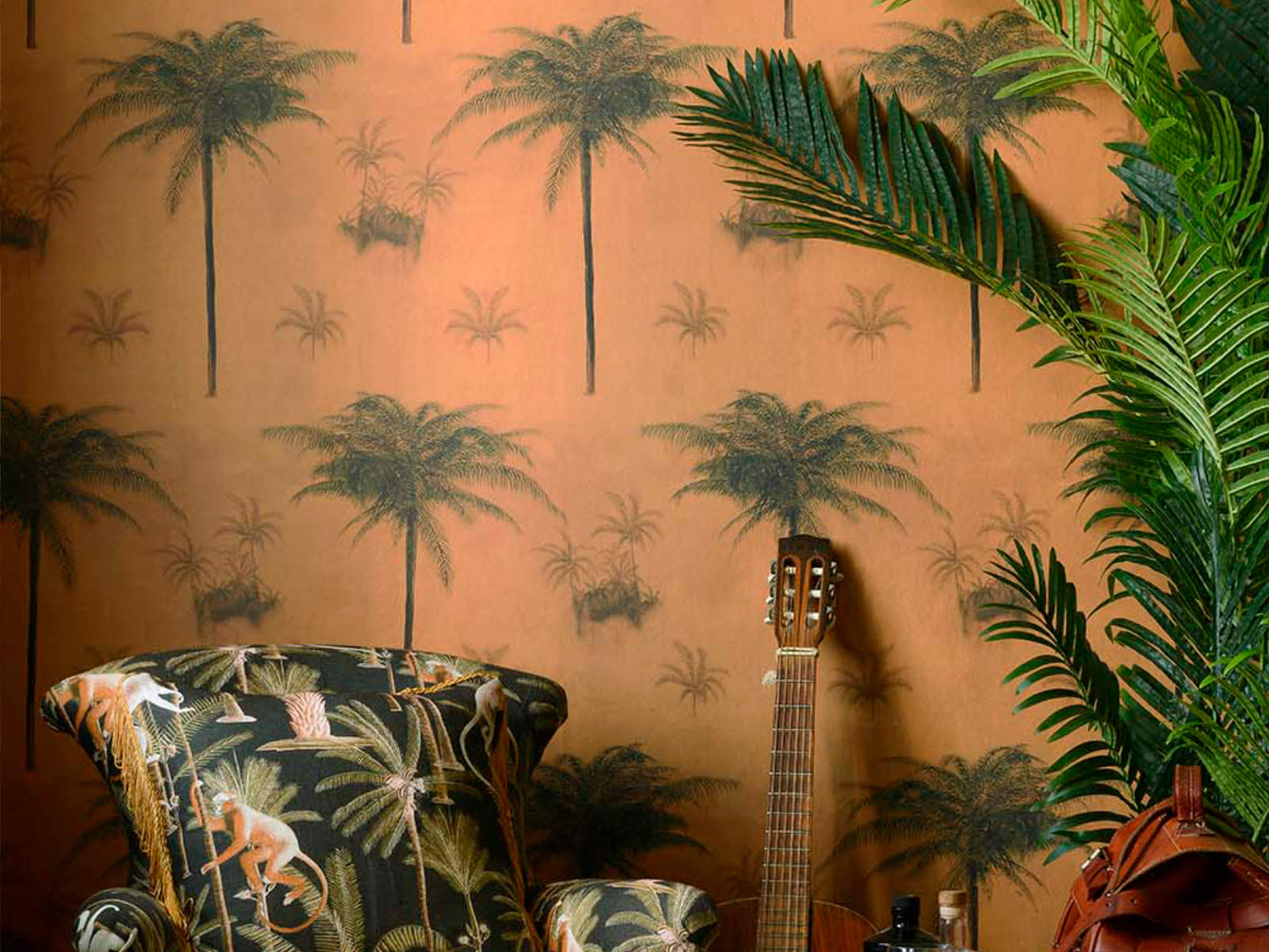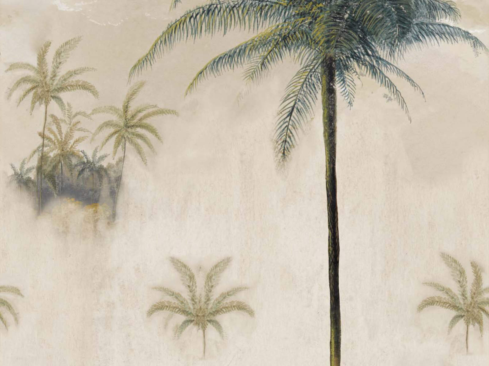 De Cubana Cayo Largo - WP20489 van Mind The Gap behang is geïnspireerd op de mooie Caribische zonsondergangen en bestaat uit grote palmboomafbeeldingen op een gewassen achtergrond. De zachte tonen en tropische elementen zorgen voor een exotische sfeer in je interieur. Dit behang is perfect voor iedereen die houdt van een relaxte en zomerse sfeer in huis.