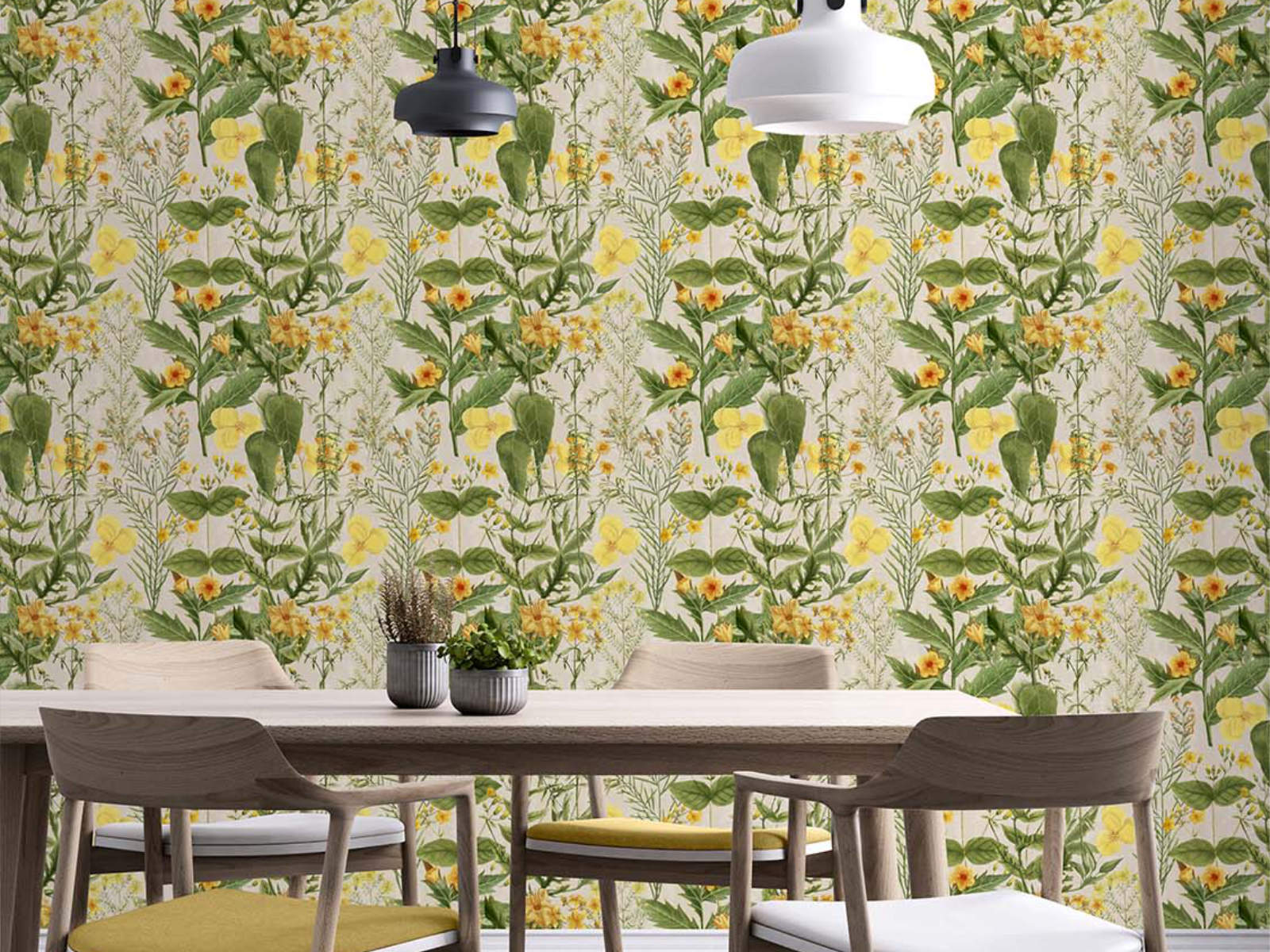 The Florilegium Mimulus - WP20323 van Mind The Gap behang heeft een luxueuze samenstelling van florale elementen en bladeren op een lichte achtergrond. Mimulus brengt de stille moed en kracht naar voren die in ons allemaal verborgen ligt.