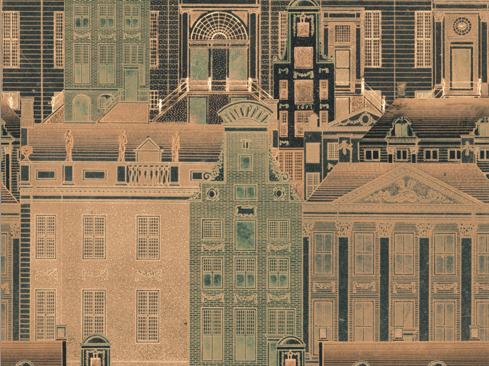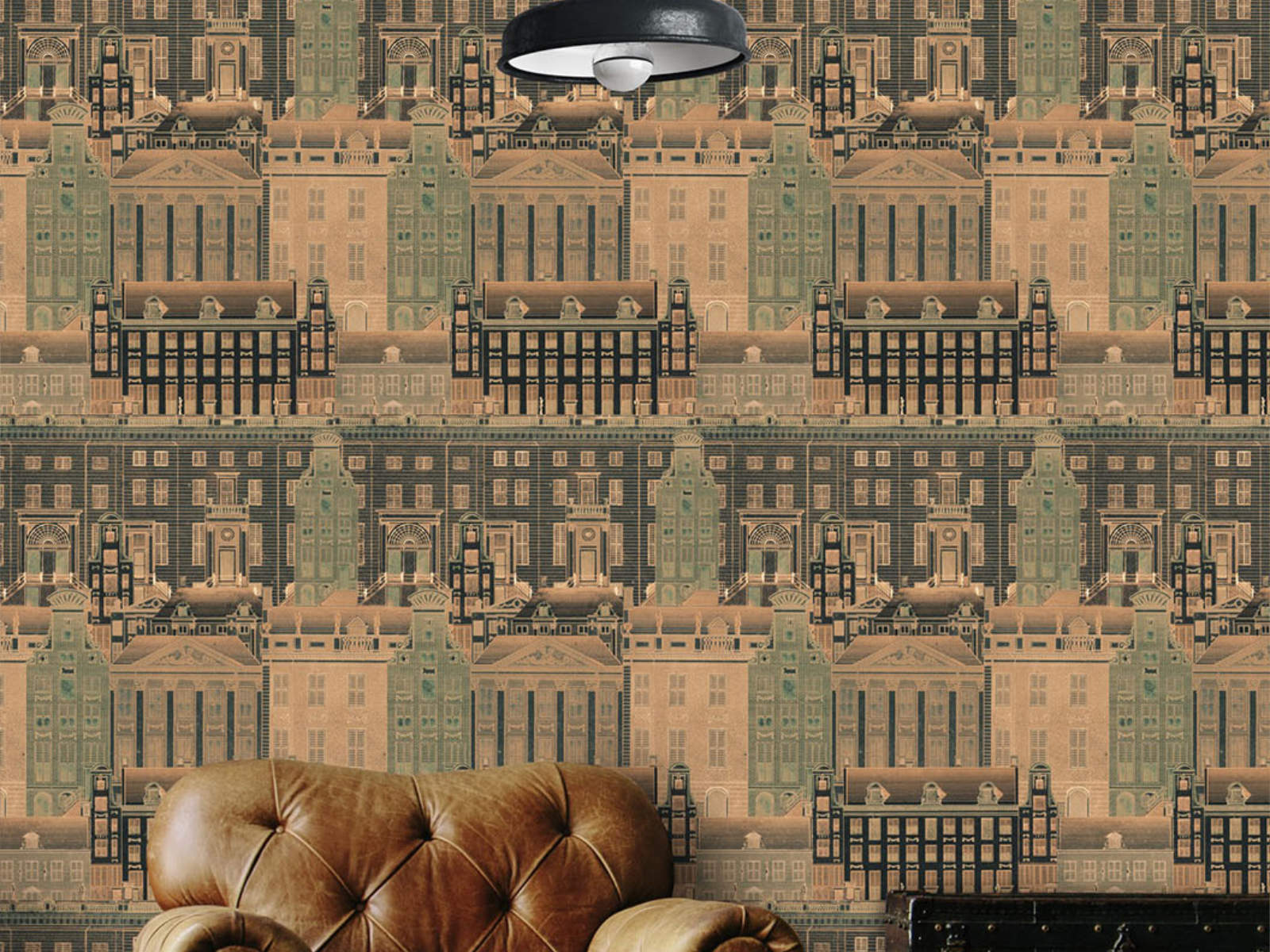 De World of Fabrics Amsterdam Orange - WP20210 van Mind The Gap behang is een behang met een warm kleurenpalet en een collage van stedelijke architectonische elementen uit Amsterdam.