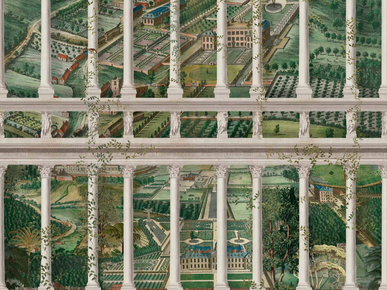 De Imaginarium Fairyland - WP20455 van Mind The Gap behang is een indrukwekkend behang met een muurschildering in sprookjesachtige stijl. Het dessin toont een verbeelding van het landschap rondom het Transylvanian Manor, met een grote muur gemaakt van architectonische kolommen en een adembenemend uitzicht op het platteland op de achtergrond. Dit behang brengt een betoverend sfeer in elke ruimte en neemt je mee op reis naar een fantasiewereld.