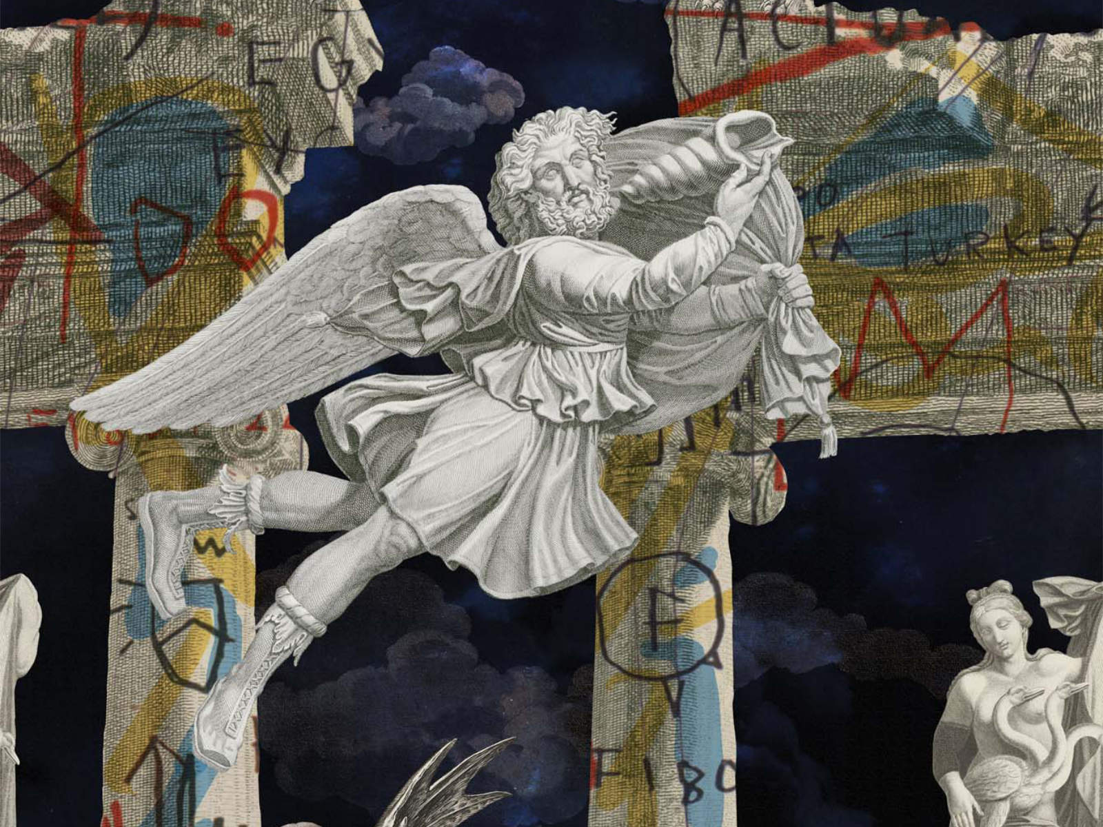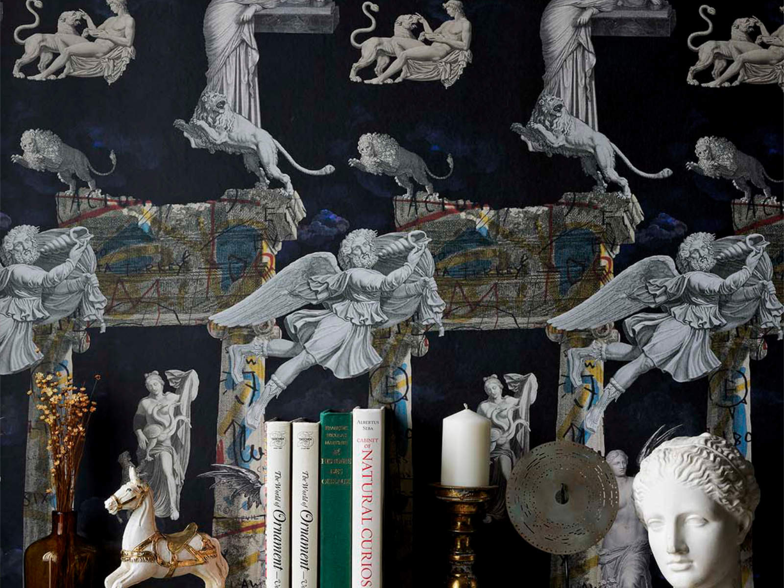 De Imaginarium Tales Of Mythology - WP20419 van Mind The Gap behang combineert beroemde standbeelden en architecturale elementen met contrasterende graffiti in een eigentijdse stijl. De zwevende standbeelden op de donkerblauwe wolkachtige achtergrond creëren een denkbeeldige wereld. Dit behang is een statement piece en zal zeker de aandacht trekken.