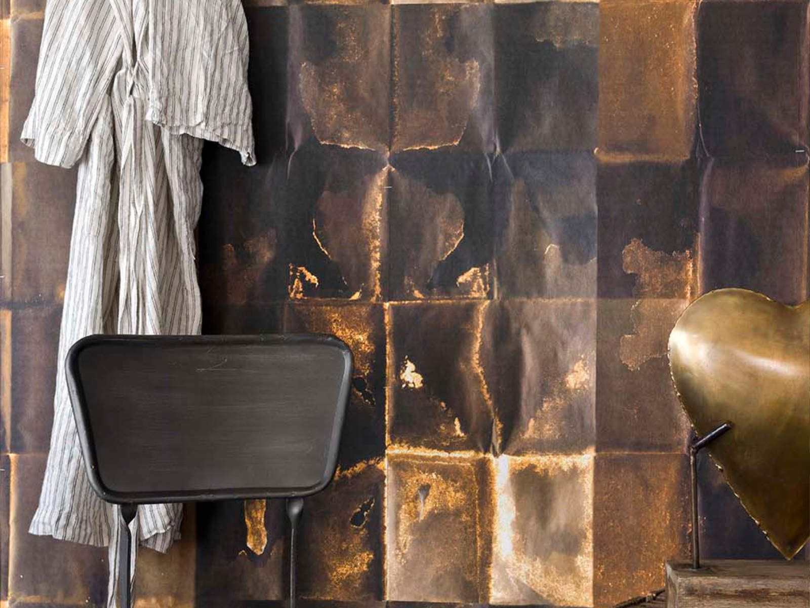 De Impermanence Shibui Copper - WP20347 van Mind The Gap behang heeft een simpel patroon in zwart en gouden tinten, met subtiele details zoals texturen die de balans vinden tussen eenvoud en complexiteit. Het ontwerp van Shibui Copper is geïnspireerd op de Japanse esthetiek van Shibui, waarin eenvoud en subtiliteit centraal staan. Het behang toont een minimalistisch patroon van zwarte en gouden strepen en texturen, waardoor het behang perfect is voor het creëren van een rustige en luxueuze sfeer in elke kamer.
