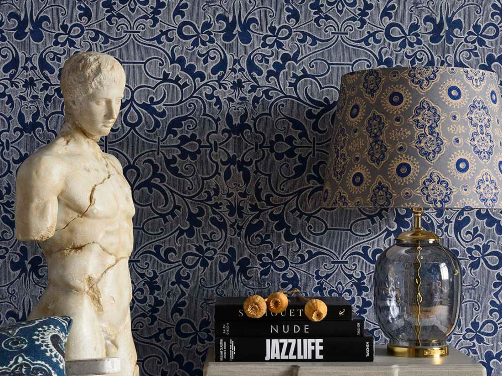 De Indigo Addiction Deco Trellis - WP20508 van Mind The Gap behang is voorzien van een mooie kanten bloemenornament in klassieke indigo tinten. Het ontwerp is geïnspireerd op antieke sierdetails die speciaal zijn gemaakt voor smeedijzeren werken. Dit behang is een echte eyecatcher en zal zeker een elegante en stijlvolle sfeer aan elke ruimte toevoegen.