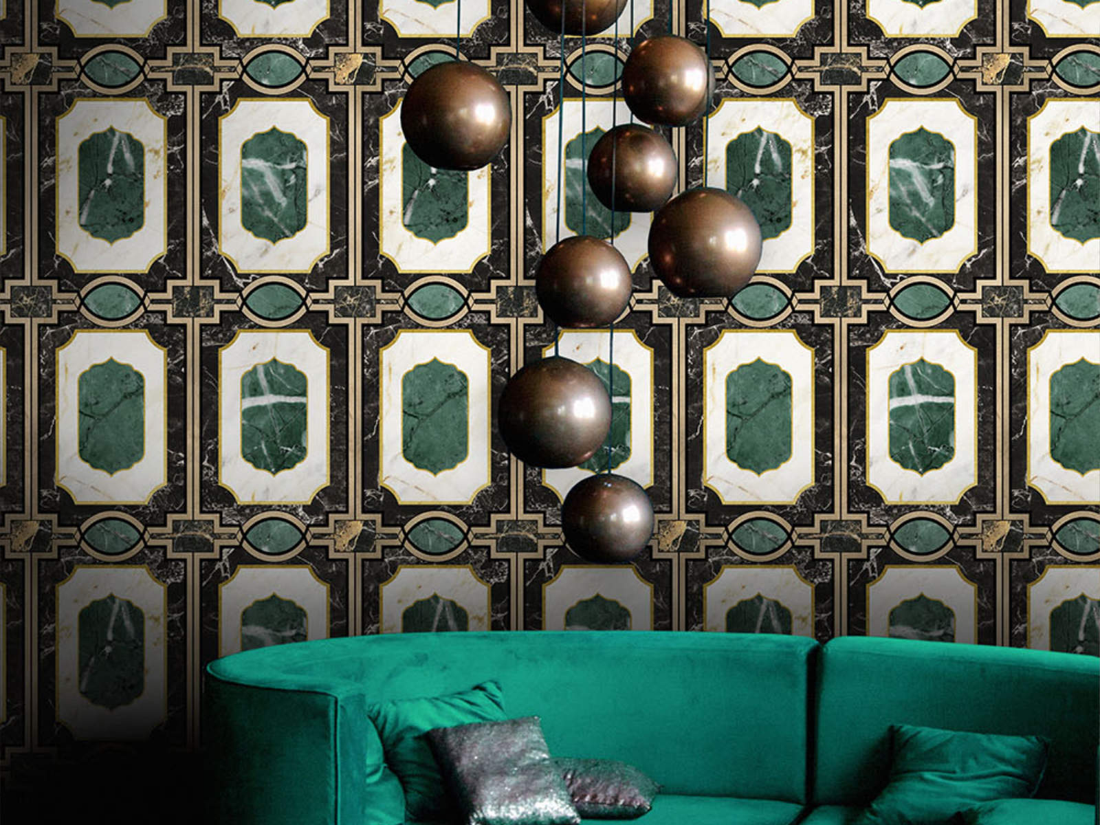 De Manhatten Waldorf Emerald - WP20356 van Mind The Gap behang is een prachtig en stijlvol ontwerp dat geïnspireerd is op de glamour van Manhattan. Het dessin is voorzien van gouden details en fantastische kleuren die elk interieur verfraaien met pure elegantie en charme. Met deze collectie haal je een echte eyecatcher in huis.