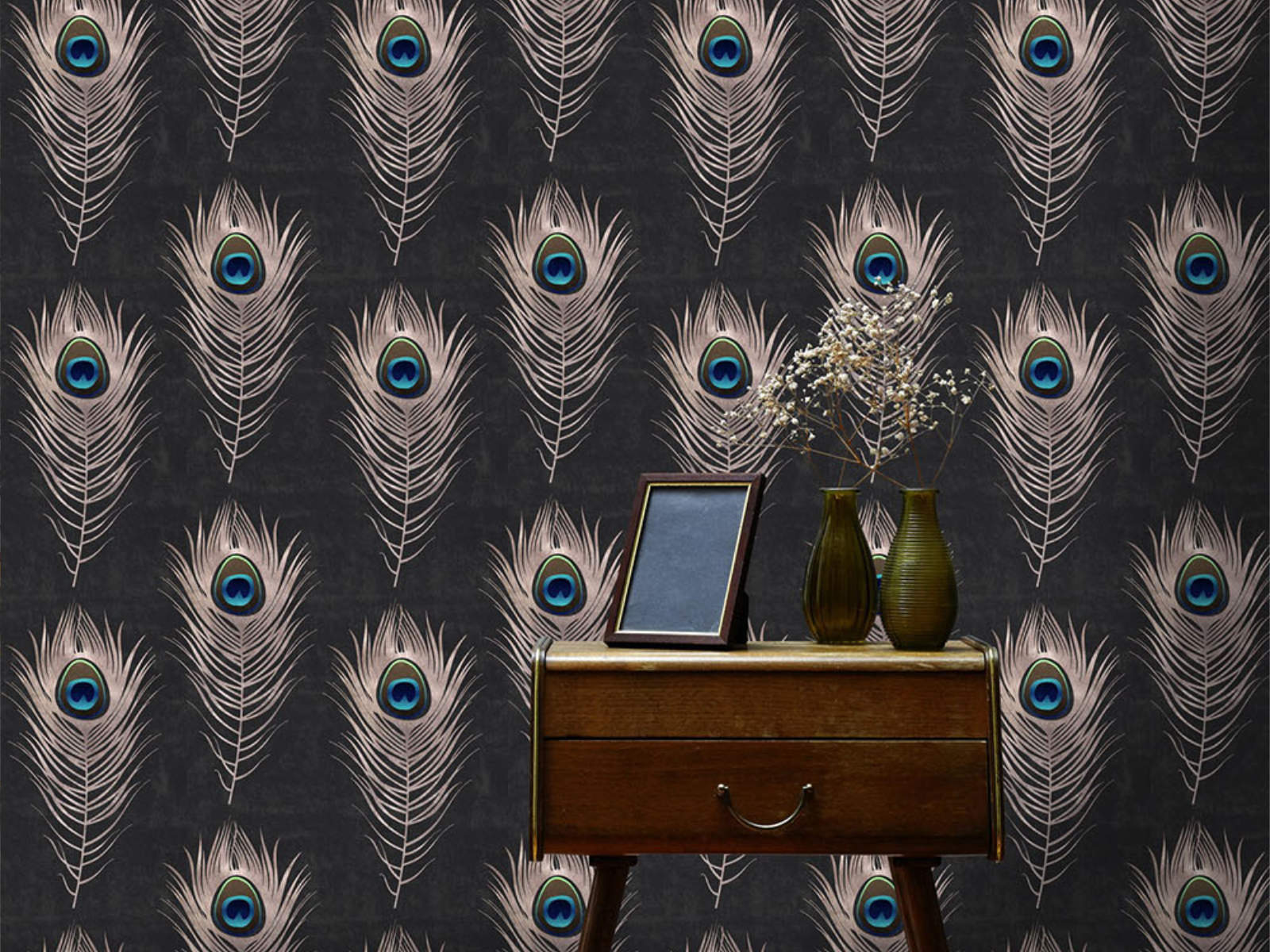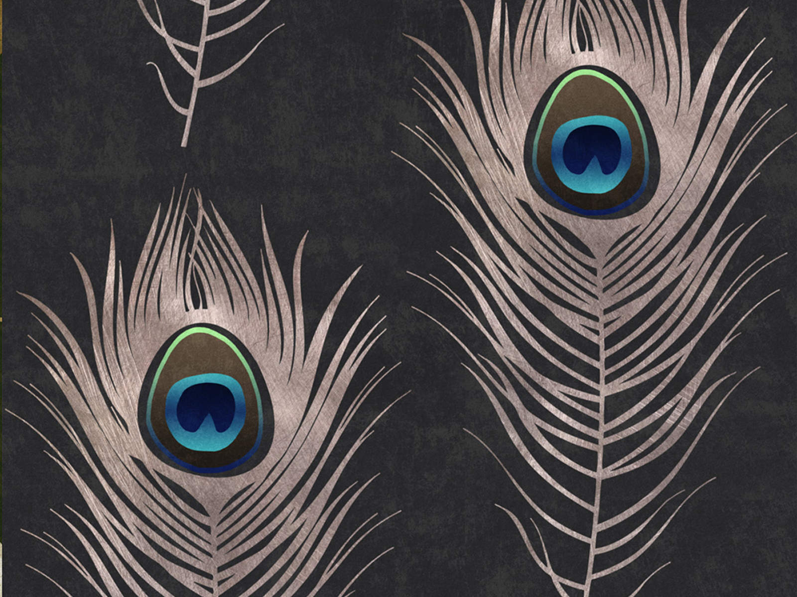 De Metropolis Peacock - WP20230 van Mind The Gap behang is een luxueus repetitief patroon met prachtige pauwenveren, ideaal voor elke ruimte.