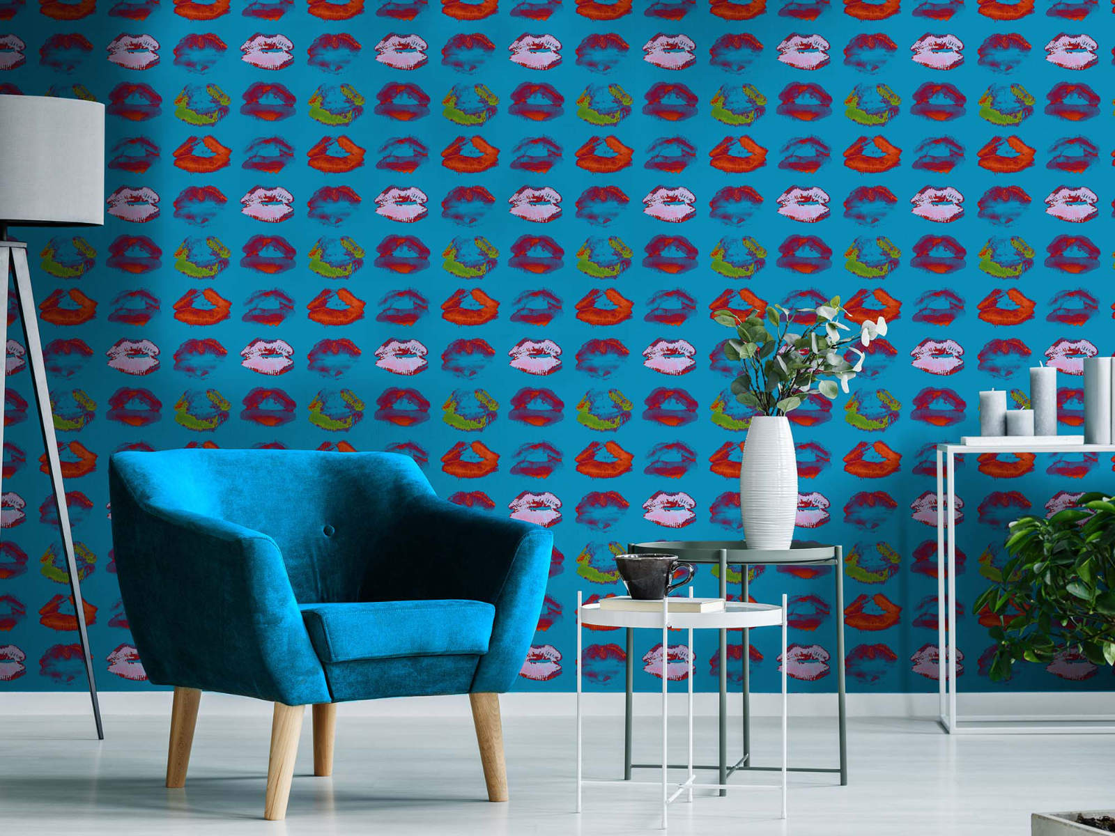De Nouvelle Pop Neon Kiss Blue - WP20379 van Mind The Gap behang is perfect voor liefhebbers van pop art wanddecoratie. Het dessin bevat een opvallende kus in diverse kleuren, waardoor het een unieke toevoeging is voor ieder interieur.