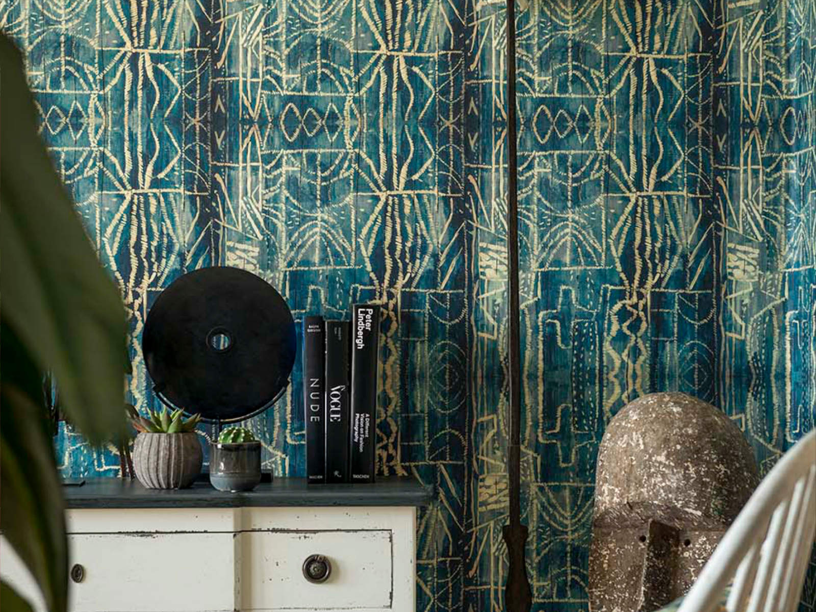 De Origins Bamileke - WP20499 van Mind The Gap behang is geïnspireerd door de cultuur van de Bamileke-stam in Kameroen. Het patroon verkent verschillende tinten blauw, gecombineerd met witte lijnen, en is gebaseerd op een authentiek handgemaakt patchwork textiel uit Centraal Afrika. Dit behang voegt een vleugje exotische stijl toe aan elke ruimte en brengt een stukje Afrikaanse geschiedenis en cultuur tot leven in huis.