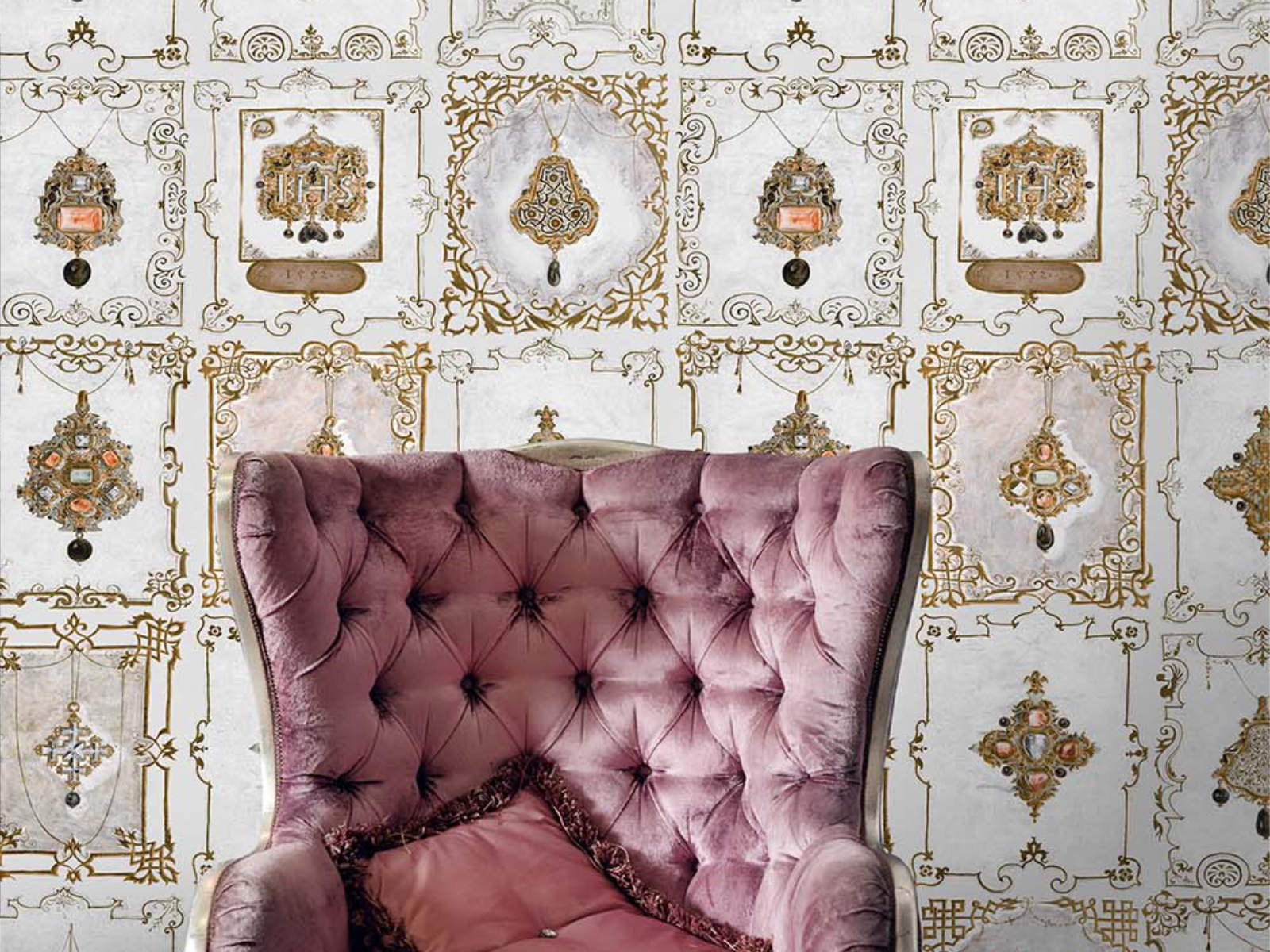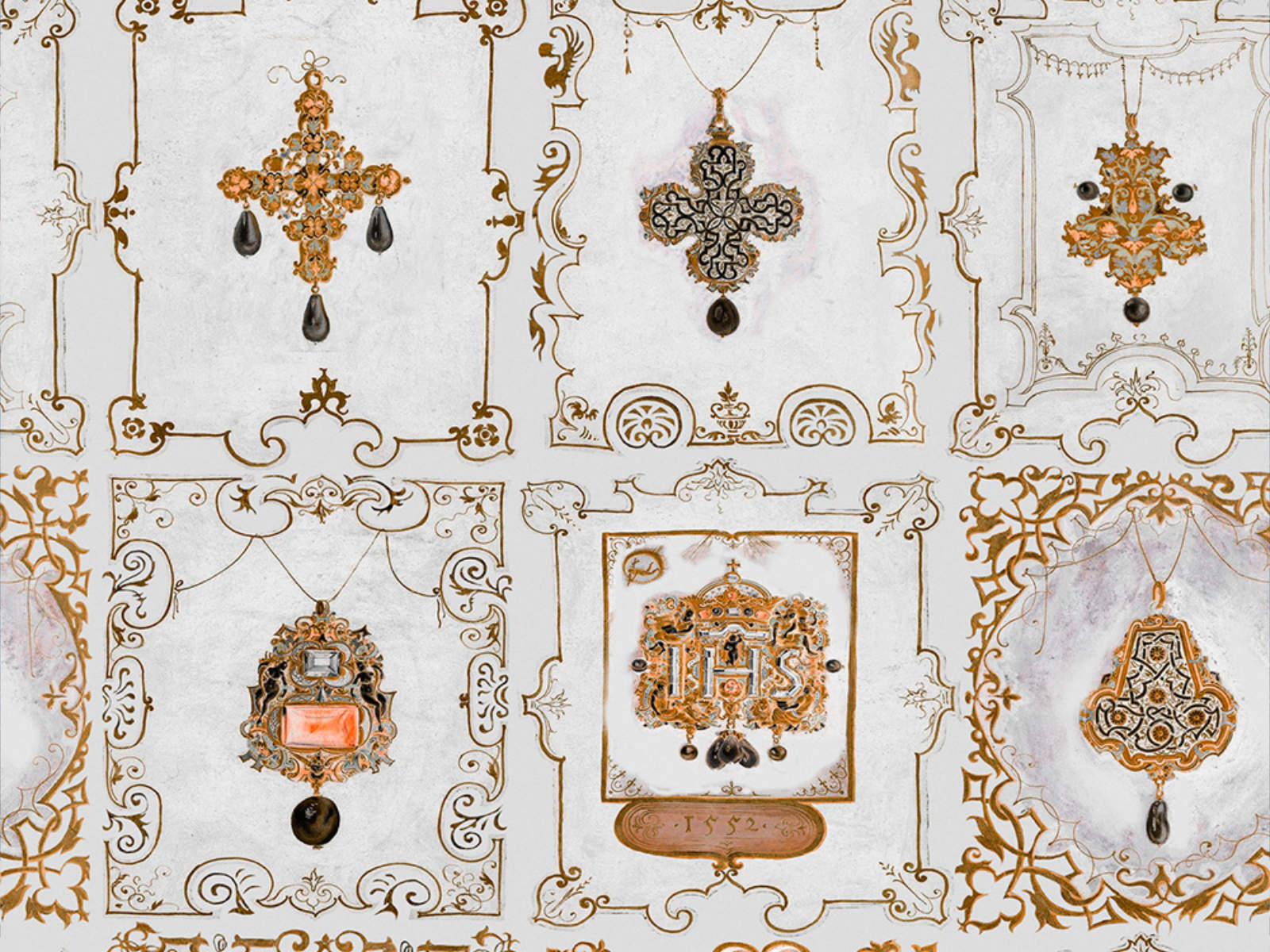 De Rinascimento Anna's Jewelry Neutral - WP20368 van Mind The Gap behang is geïnspireerd op antieke sieraden uit het unieke manuscript "Jewel Book of the Duchess Anna of Bavaria". Het tijdloze ontwerp van deze collectie brengt je in een andere gemoedstoestand. Het dessin is werkelijk prachtig en neemt je mee terug in de tijd naar een periode van schoonheid en verfijning. Het is een echte aanrader voor iedereen die houdt van elegantie en stijlvolle interieurs.