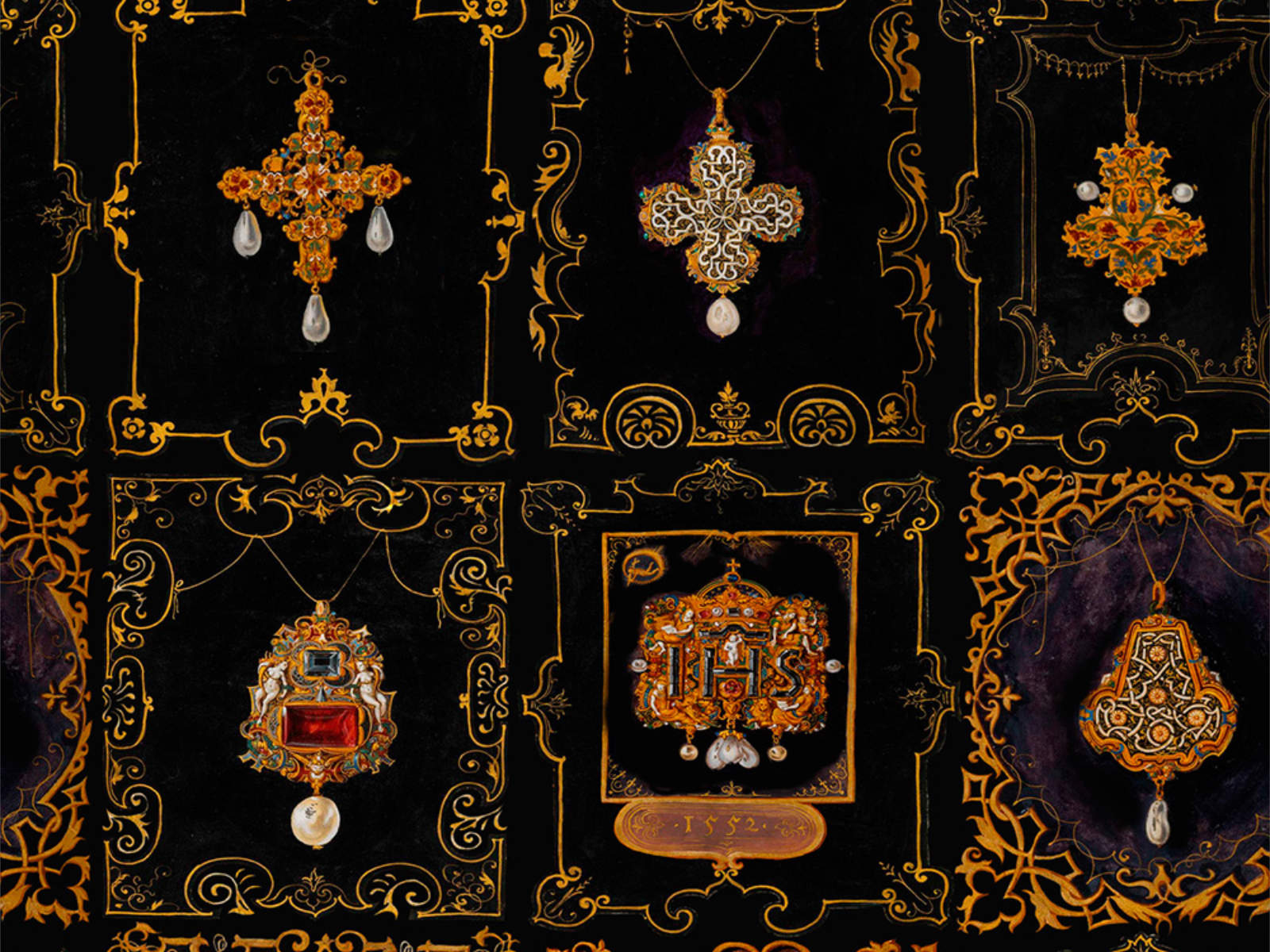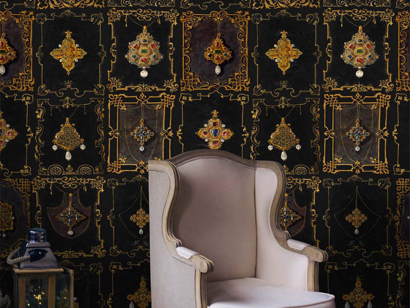 De Rinascimento Anna's Jewelry - WP20369 van Mind The Gap behang is geïnspireerd op antieke sieraden en heeft een zwarte achtergrond. Het dessin is gebaseerd op het unieke manuscript "Jewel Book of the Duchess Anna of Bavaria". Dit tijdloze ontwerp brengt je in een andere gemoedstoestand.