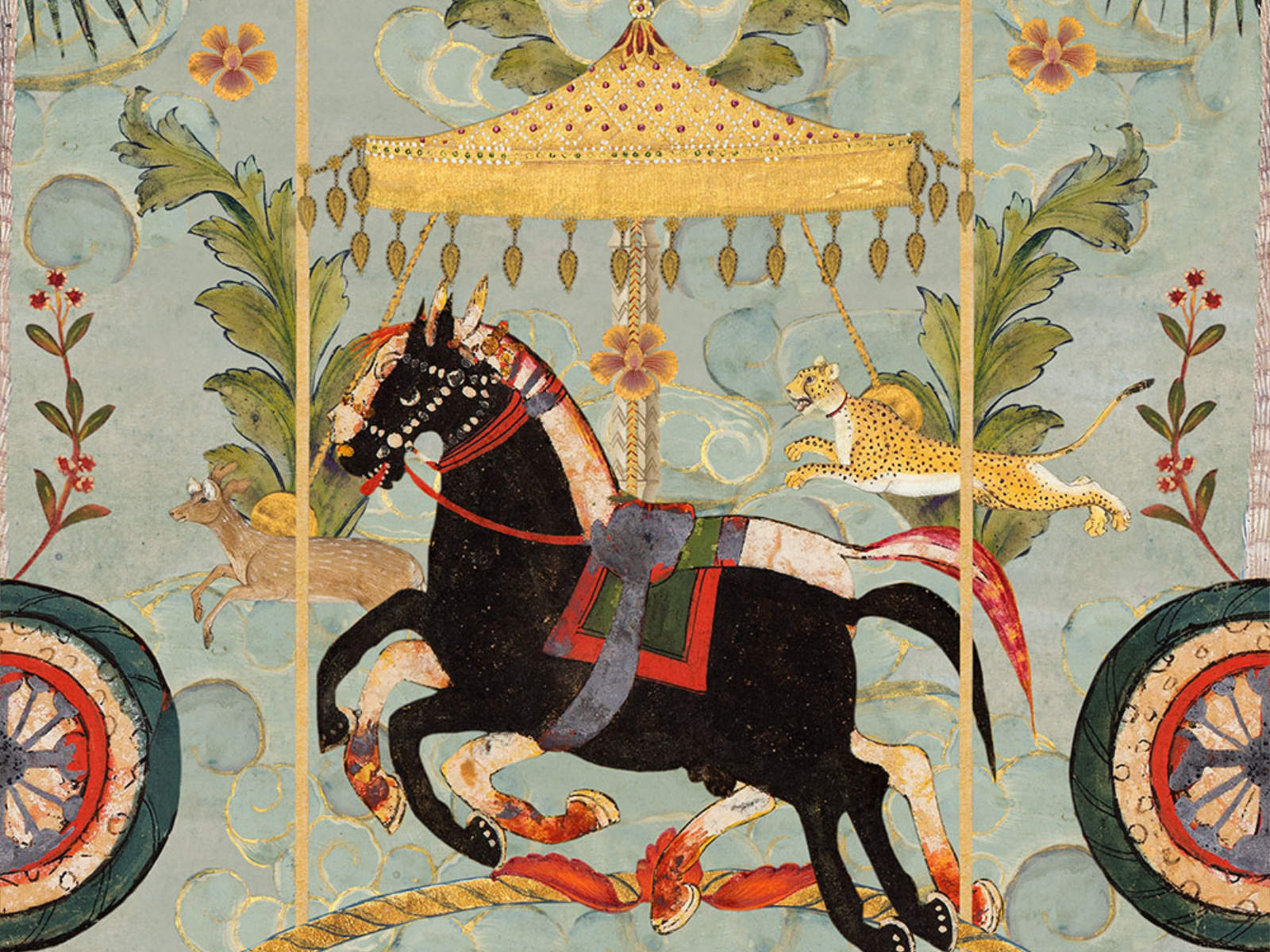 De Tales Of Maghreb Yennayer Agate - WP20751 van Mind The Gap is een door de oceaan geïnspireerd decor en vormt de perfecte achtergrond voor de feestelijke scènes die afgebeeld zijn op dit ontwerp. Dartelende paarden, versierd met decoraties, brengen een speelsheid in het ontwerp, geplaatst naast een overvloed aan vogels en dieren die elk hun eigen dynamiek toevoegen. Verfijnde architectuur biedt een grootsheid, te midden van opvallend groen en luchtige wolkachtige vormen. Een betoverend en boeiend ontwerp.