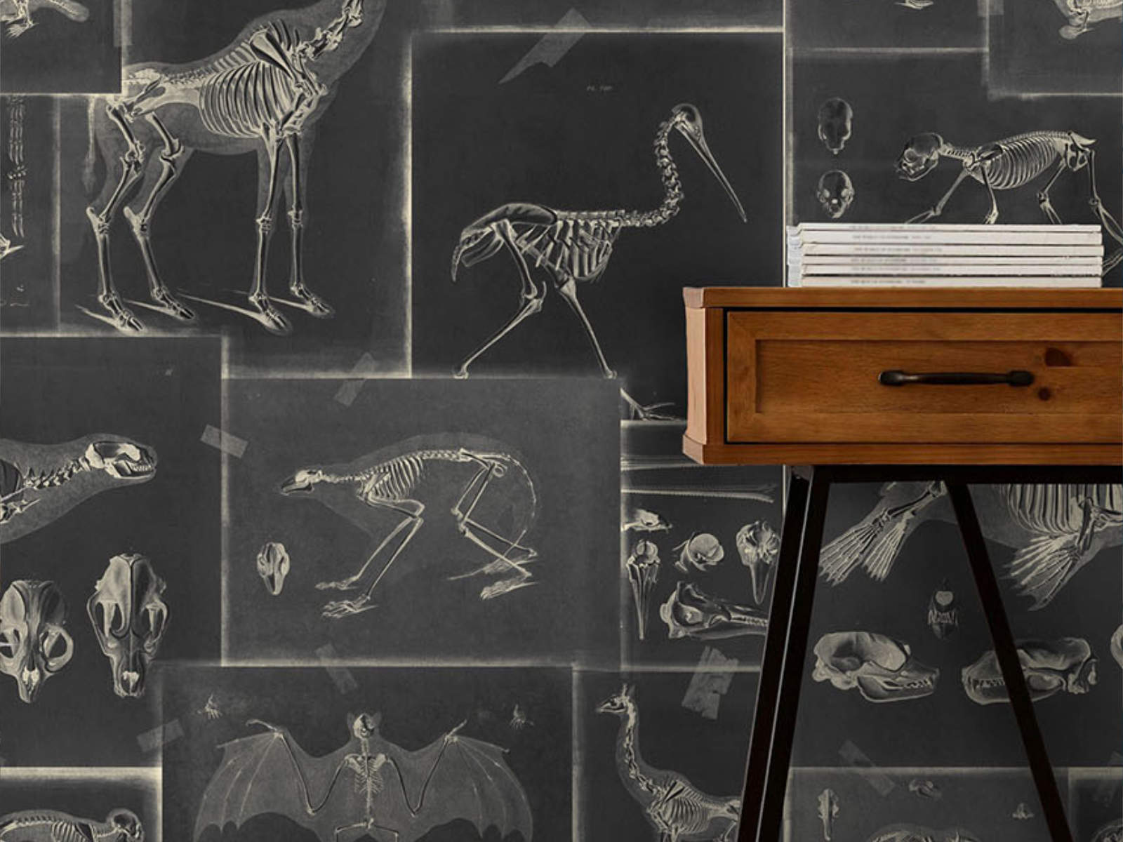 De Antiquarian Zooarchaeology Anthracite - WP20237 van Mind The Gap behang is geïnspireerd op het levenswerk van een mysterieuze antiquair. Het Zooarchaeology dessin is gedrukt op 3 banen behang en brengt een vleugje geschiedenis in je interieur.