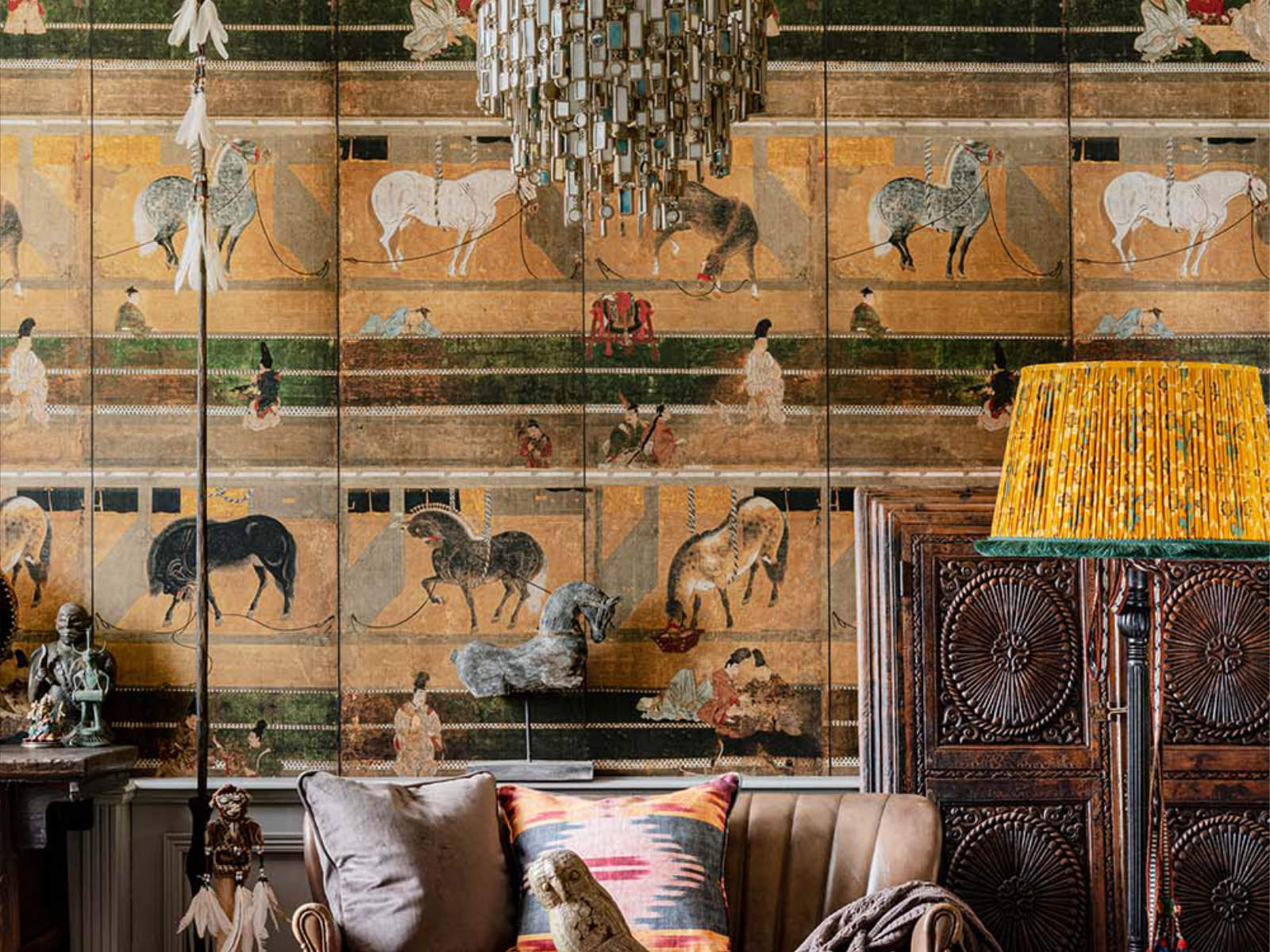 The Curator's Cabinet Horse Stable - WP20650 van Mind The Gap behang is een reis naar het oude China en het levendige leven in een verre stal, om erachter te komen wat er echt gebeurt als de dieren rusten. Ga zitten met de stalknechten voor een bordspel, ren met de honden, kijk naar de valkenier of neem een dutje - alles is mogelijk in deze levendige oosterse enclave. Krachtige monochrome paarden pronken trots met hun spieren en gevlochten haar in hun stoffige, zandkleurige boxen, terwijl de ruimte tussen hen is bekleed in tijd versleten rijk groen, zowel dieren als loopbrug vormen subtiele strepen op de muur voor een patroon vol verrassend verhaal en energie.