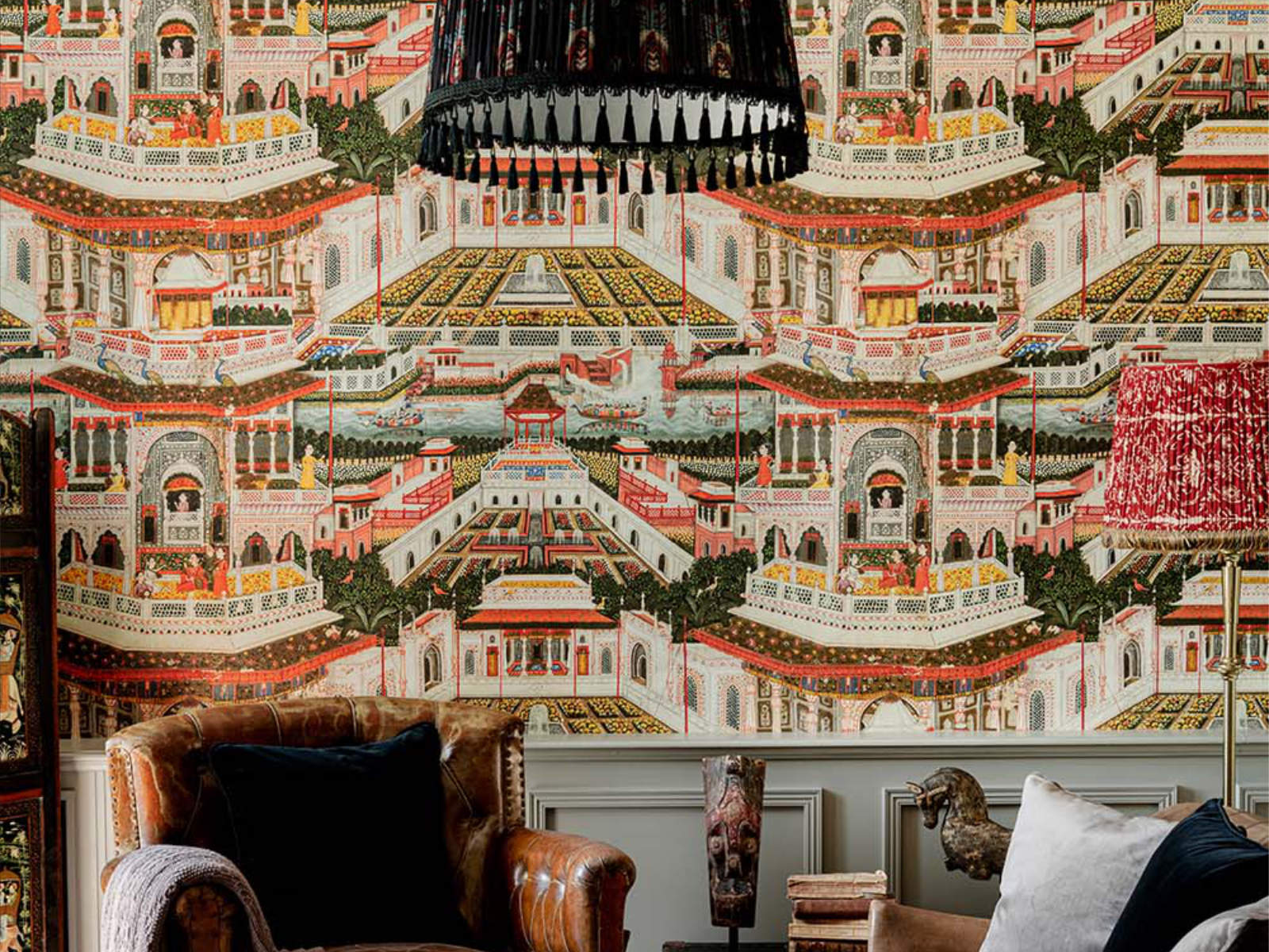 The Curator's Cabinet Indian Palace - WP20651 van Mind The Gap behang is een uitnodiging voor de meest verfijnde reiziger - deze Indiase koninklijke residentie laat niet zomaar iedereen zijn grenzen overschrijden. Dwaal door de prachtige tuinen terwijl de bedwelmende geur van duizend bloemen en zachte sitarmuziek op de wind drijven. Een ontwerp dat de bezienswaardigheden, geuren en zachte pasteltinten van koninklijk Rajasthan oproept. Bewonder weelderige motieven die zich rond de muren winden, staar in verbazing naar kleurrijke vogels die door de lucht duiken en strijk met je handen door koele waterpartijen terwijl het leven doorgaat in dit elegante patroon.