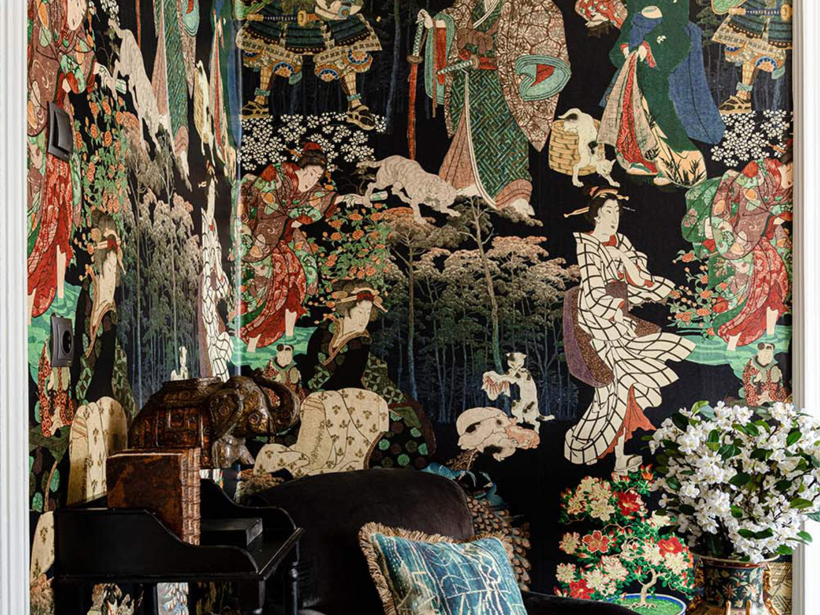 The Curator's Cabinet Samurai And Geisha - WP20653 van Mind The Gap behang is een ontmoeting met legendarische personages uit het oude Japan. Vermeng je met machtige krijgers en elegante gastvrouwen in dit behang, dat levendig is met kleurrijke traditionele Japanse personages die tevoorschijn komen uit een bos bij nacht. Je moet je voor de gelegenheid kleden - hier is elk personage levendig versierd met wilde patronen en stromende kimono's, waarbij de kunstzinnige drapering van de stof decoratie en beweging op de muren brengt. Van bloem- en natuurlijk geïnspireerde ontwerpen tot geometrische graphics en alles daartussenin, elk personage is gekleed in een outfit die de meest gevierde stylist waardig is en die op hun beurt de muur verfraaien met hun gedurfde patronen. Staande te midden van wiegende bomen, uitgestrekte bloemen en opvallende wilde dieren, schitteren de prestigieuze figuren helder op een achtergrond van diep middernachtblauw.