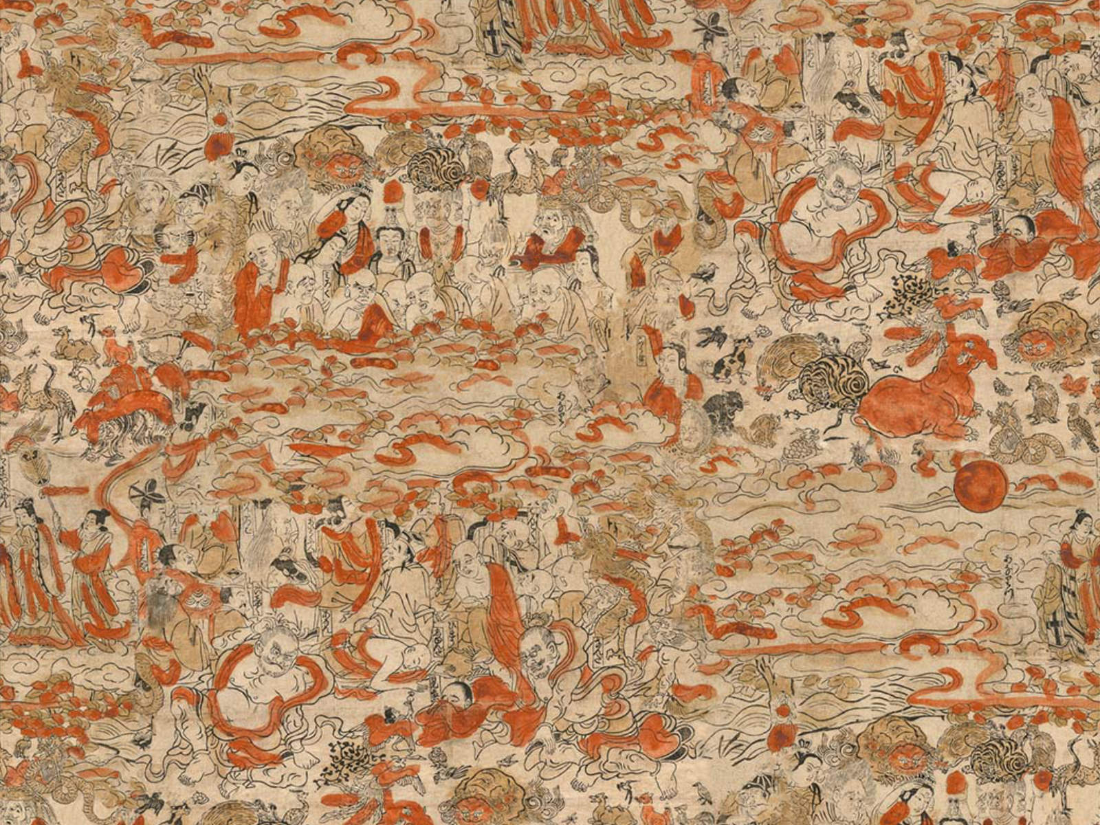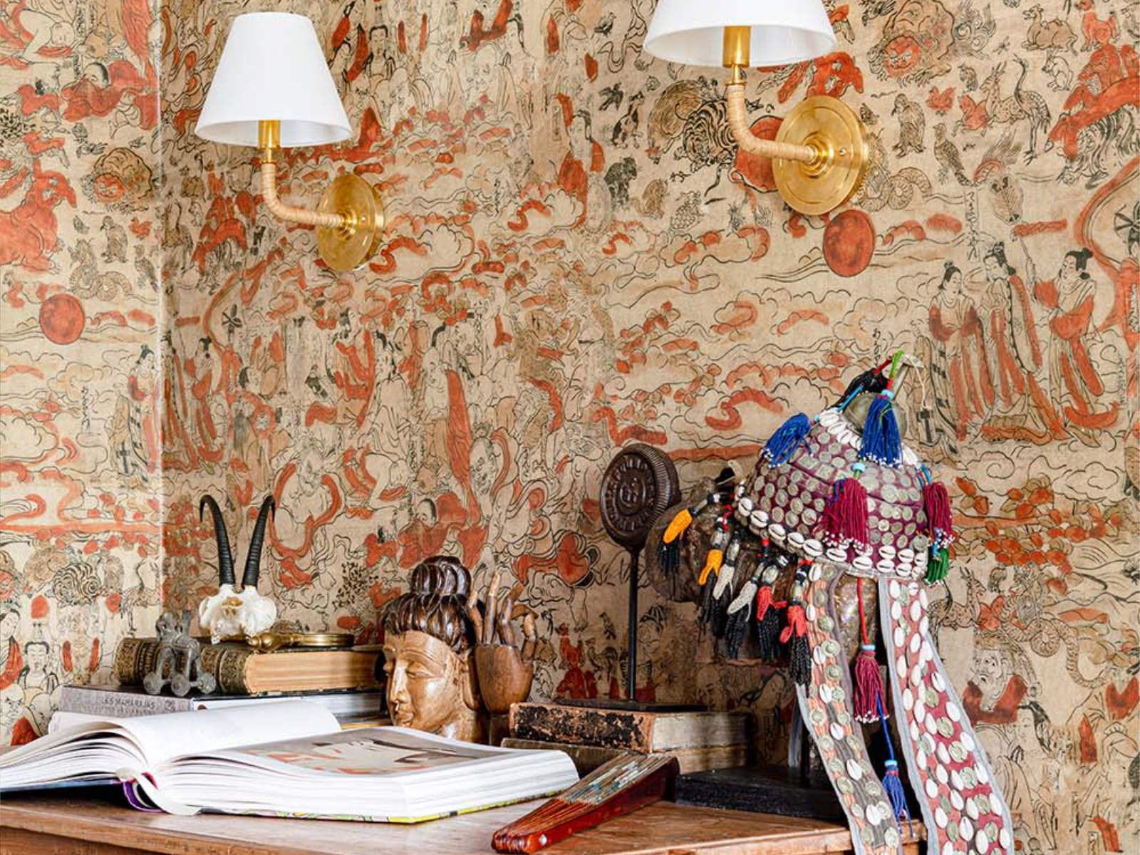 The Curator's Cabinet Spiritural Journey - WP20652 van Mind The Gap behang is een reis naar een spirituele wereld. Stap iets dichterbij - van veraf lijkt dit behang behang misschien op een abstract squiggle patroon, maar bij nadere inspectie ontdek je een heleboel met de hand getekende personages die leven op een bleke beige achtergrond tussen vlekken van kleur. Zwevend als rook of mist, navigeert een roestige, oranje toon zich een weg rond mensen, planten, dieren, wolken en kalligrafie, die allemaal worden geïllustreerd als eenvoudige lijntekeningen in de oude Chinese stijl. Neem de tijd om elke centimeter te verkennen en jezelf onder te dompelen in een veelheid van verhalen kunstig in elkaar verweven en wachtend om ontdekt te worden.
