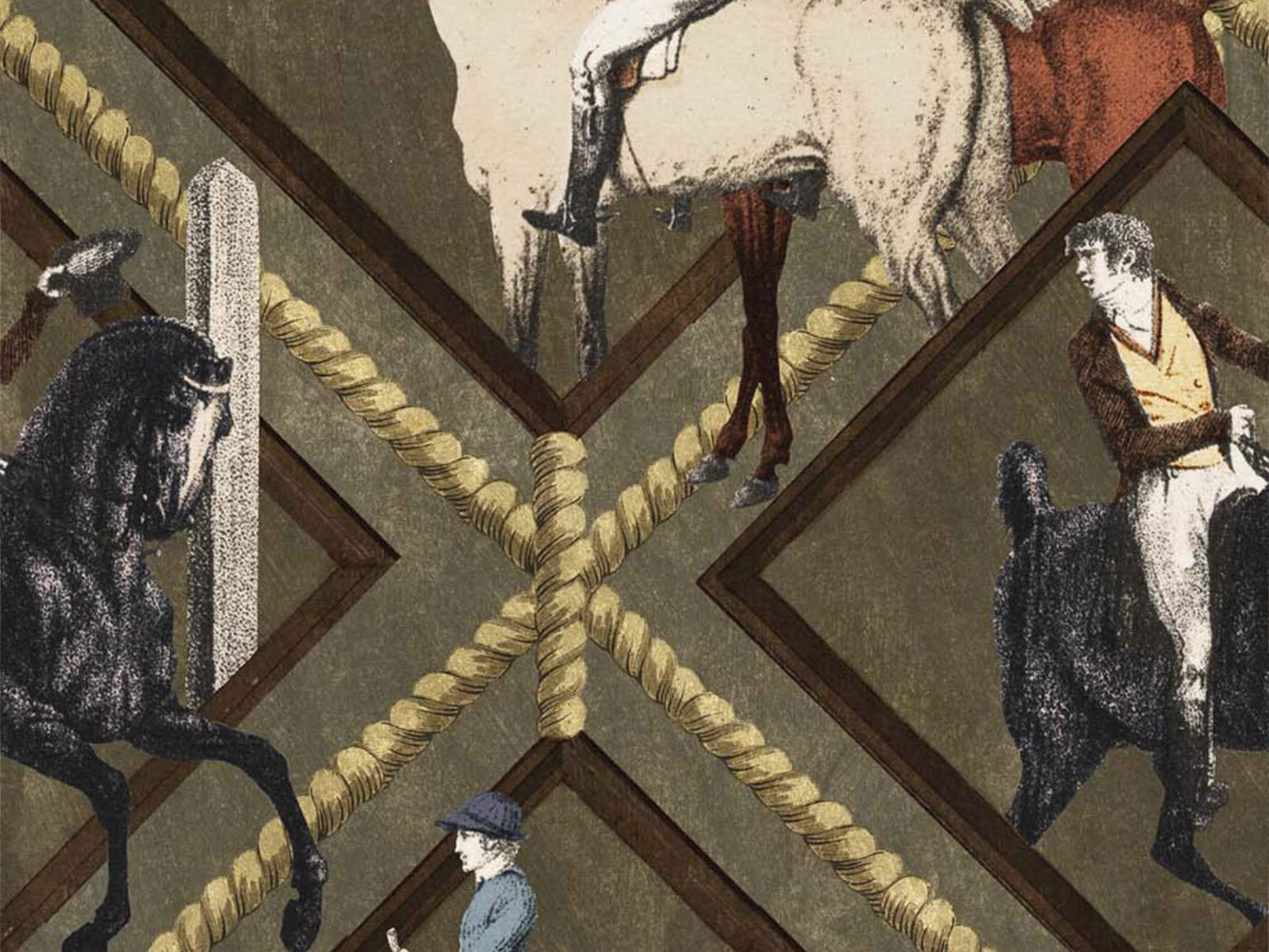 The Artist's House Gymkhana Grey - WP20639 van Mind The Gap behang is geïnspireerd op de goede competitie, toewijding en showmanship van de paardenwereld, een patroon dat de vaardigheden van ruiter en paard weergeeft. Alleen de snelste en meest energieke dieren nemen deel aan deze wedstrijd en tonen hun perfecte vormen door te draven, galopperen, rennen en springen tussen hun diamantvormige omheiningen, terwijl ruiters recht van rug zijn, perfect gepositioneerd en klaar om te racen. De zwarte diamantvorm van de paardenpennen en de omringende lijnen van gedraaid touw geven dit behang een structuur, geometrisch gevoel, dat wordt onderbroken door de speels springende pony's - kies uit een warme groene tint of een meer vervaagde grijze tint.