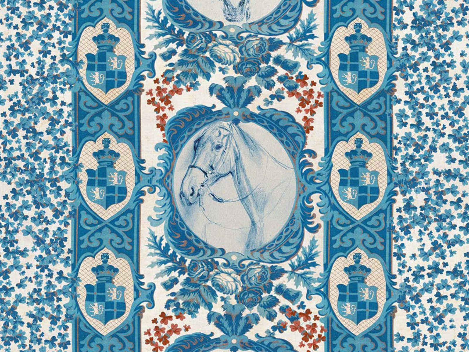 The Artist's House The Competition Panel Blue - WP20634 van Mind The Gap behang is geïnspireerd op de schoonheid van paarden en de formaliteit van portretfotografie. Dit behang vereeuwigt de meest prachtige paarden, met hun luxueuze manen, glanzende vachten en lange wimpers, en bekroont ze met de best in show rozet. Elke handgetekende kop wordt versierd met Britse flora, met delicate rozen, distels en varens verweven in het extravagante frame. Majestueuze wapenschilden vormen een subtiele lineaire streep naast de illustraties, terwijl miniaturen van schilderachtige bloemblaadjes de ondersteunende gestreepte achtergrond vormen, verkrijgbaar in een rijke rode tint met contrasterende blauwe bloemendetails, of omgekeerd.