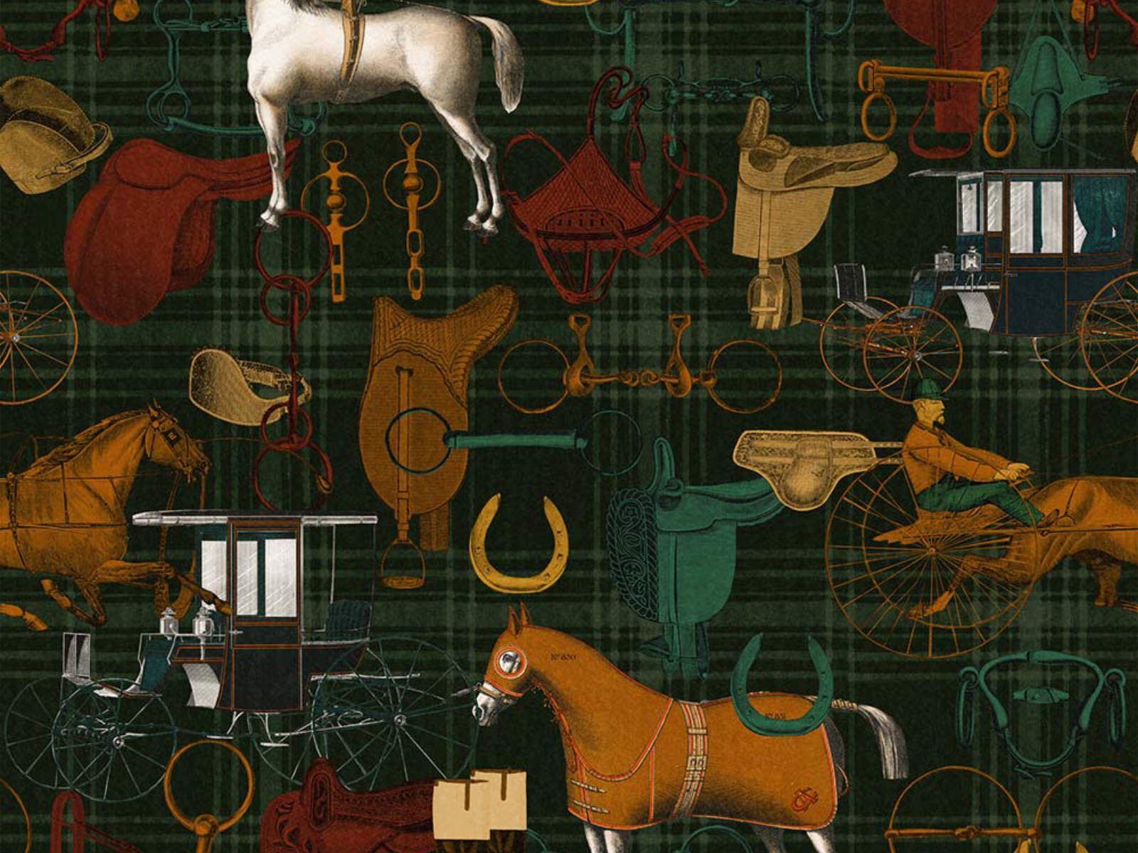The Artist's House The Jockey Multicoloured - WP20642 van Mind The Gap behang is geïnspireerd op de uitrusting van een ruiter, een behang dat een gedetailleerde inventarisatie geeft van alles wat een ruiter nodig heeft voor een bevredigende rit. Glanzende hoefijzers, leren zadels, hoofdstellen, laarzen en rijtuigen geven instructies in de kunst van het paardrijden en verzorgen. Elk item is zorgvuldig afgebeeld in getekende stijl uit het einde van de 19e eeuw, terwijl het patroon is ingekleurd met rijke, koninklijke tinten variërend van donkerrood tot smaragdgroen en aardse bruine kleuren, met een achtergrond van donker geruite patronen die het ontwerp een air van de gentleman's club, drawing room of bibliotheek geeft.