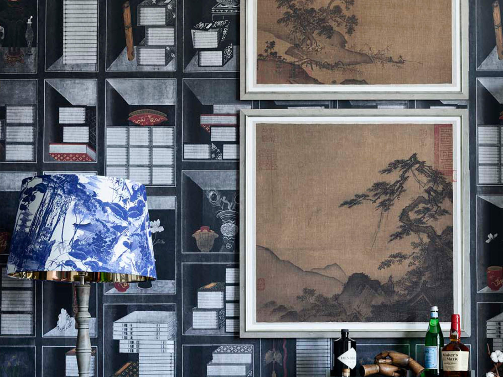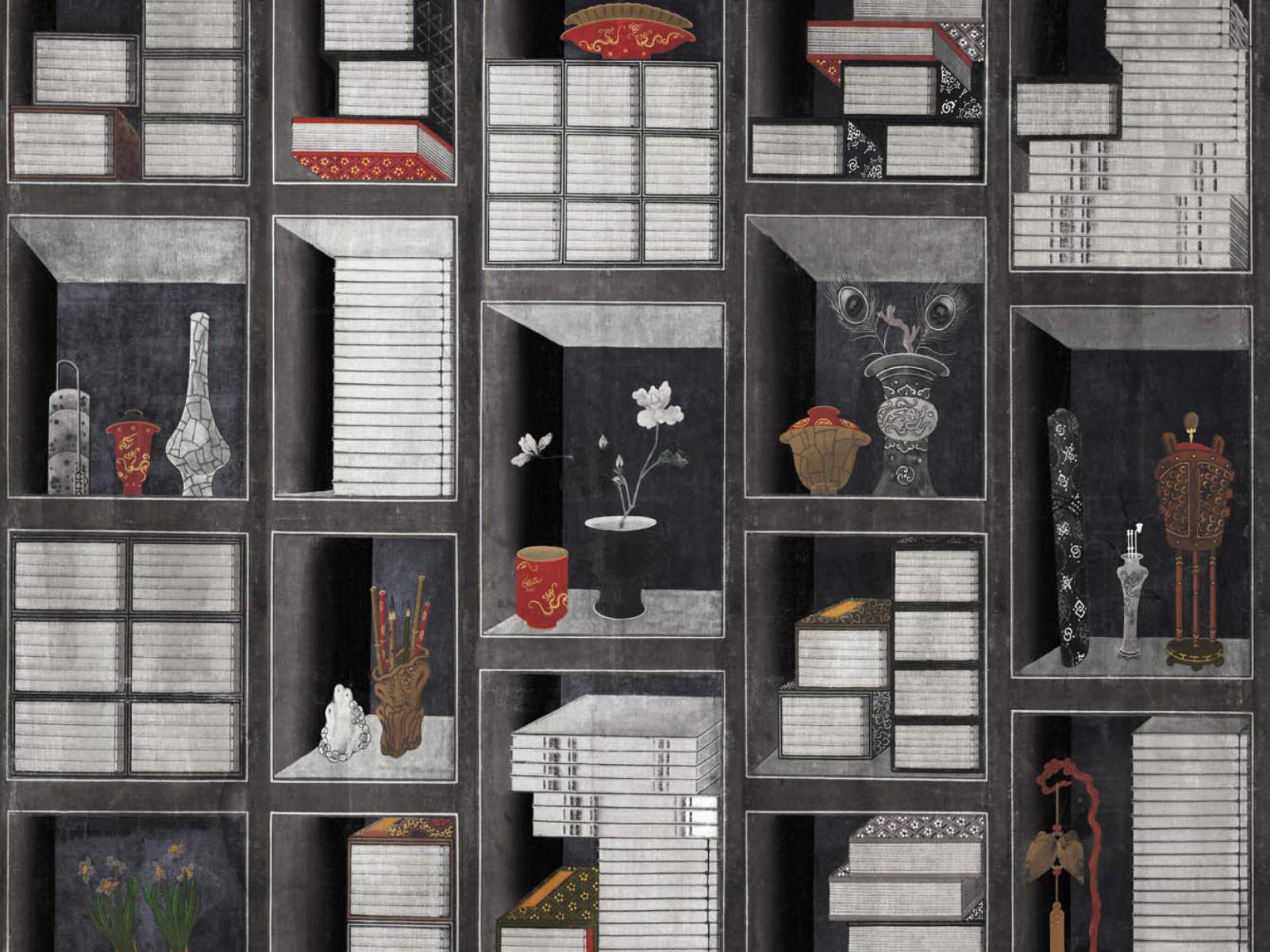 The Gentlemen's Corner Korean Library - WP20421 van Mind The Gap behang is een prachtig trompe l'oeil behang met een afbeelding van een oude Koreaanse bibliotheek op een opvouwbaar zijden scherm. Het behang is een ware eyecatcher en een unieke wandbekleding. Het dessin is verdeeld over 3 rollen en bevat boeken en voorwerpen die tot in de kleinste details zijn geschilderd. Met dit behang voeg je een stukje kunst aan je interieur toe.