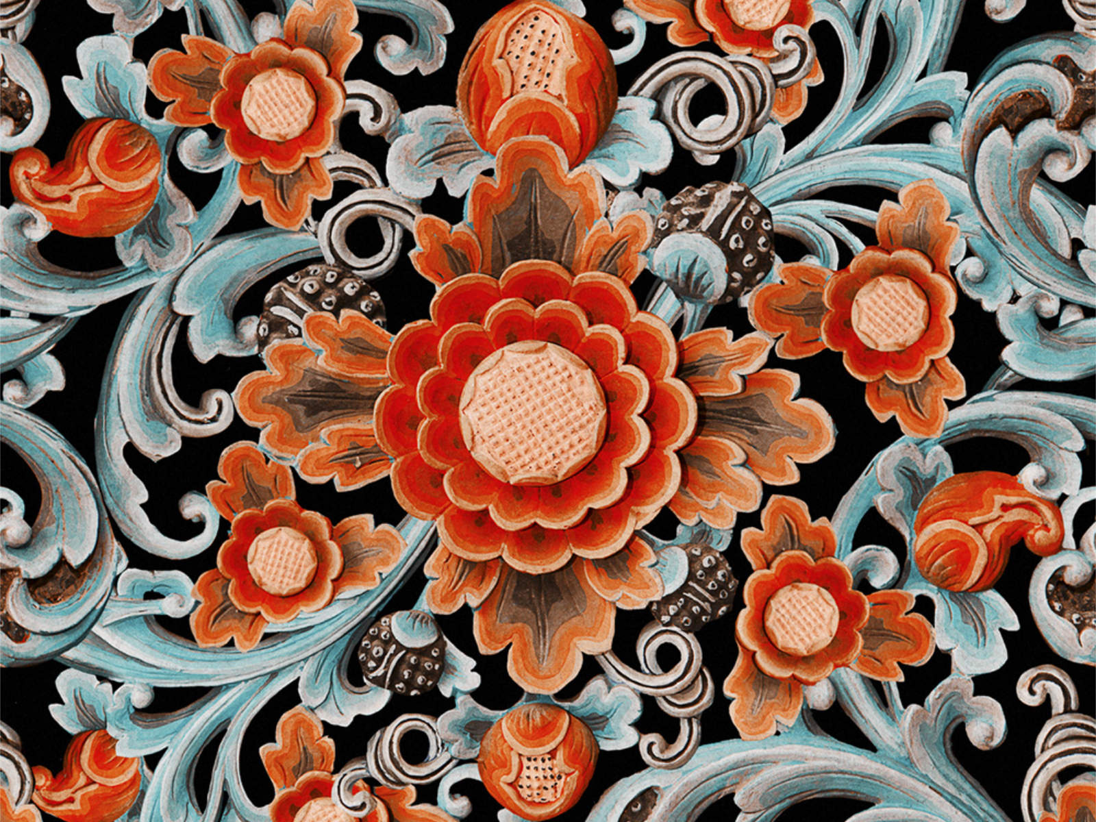 The Mysterious Traveler Floral Painting Dark - WP20252 van Mind The Gap behang is een adembenemend ontwerp, met met de hand beschilderde, krachtige bloemmotieven in levendige kleuren. Transformeer je interieur met dit betoverende behang.
