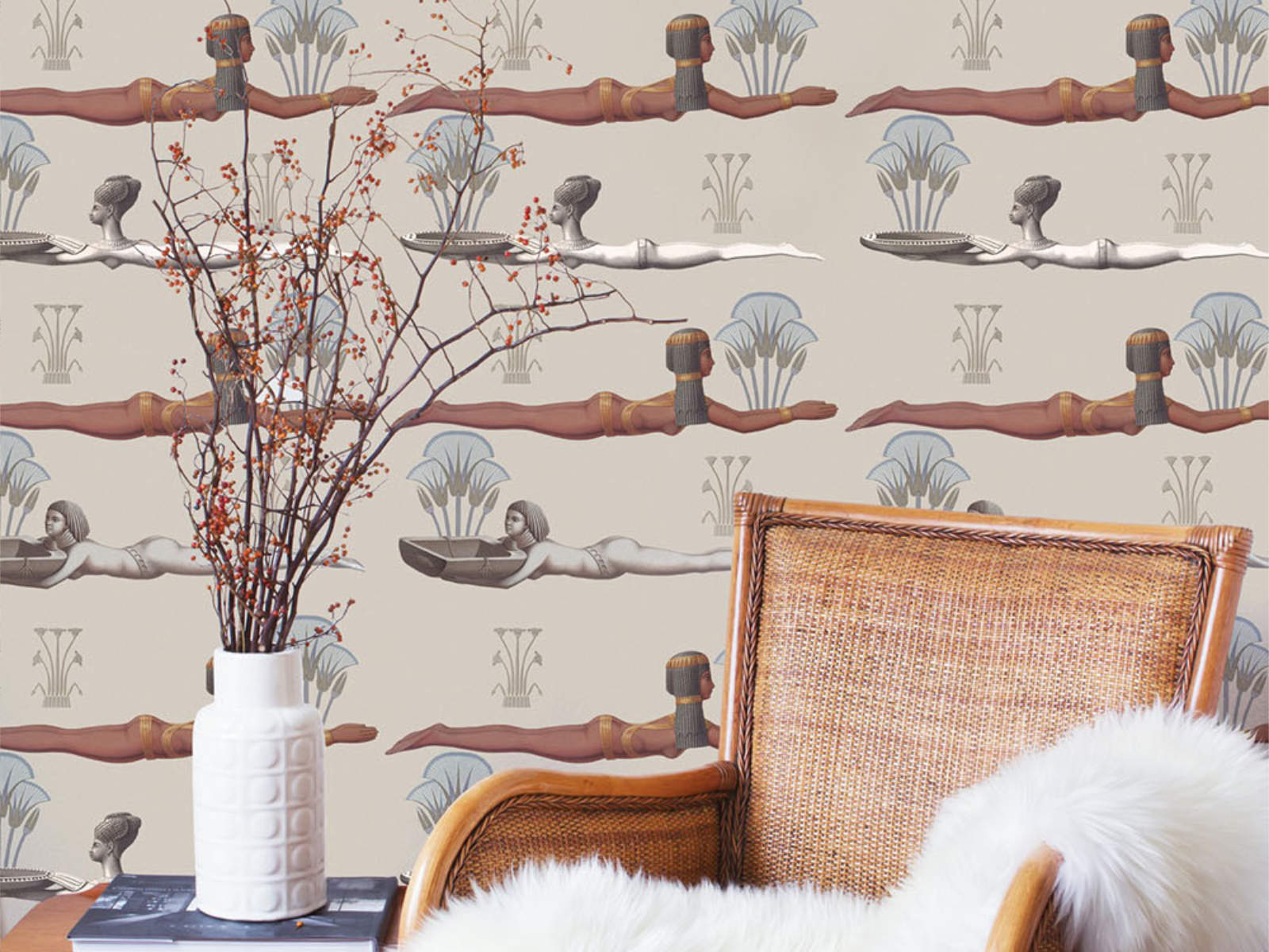 De World of Antiquity Egyptum Taupe - WP20193 van Mind The Gap behang is een decoratief ontwerp op een crèmekleurige achtergrond, geïnspireerd door de weelde van de Egyptische cultuur.
