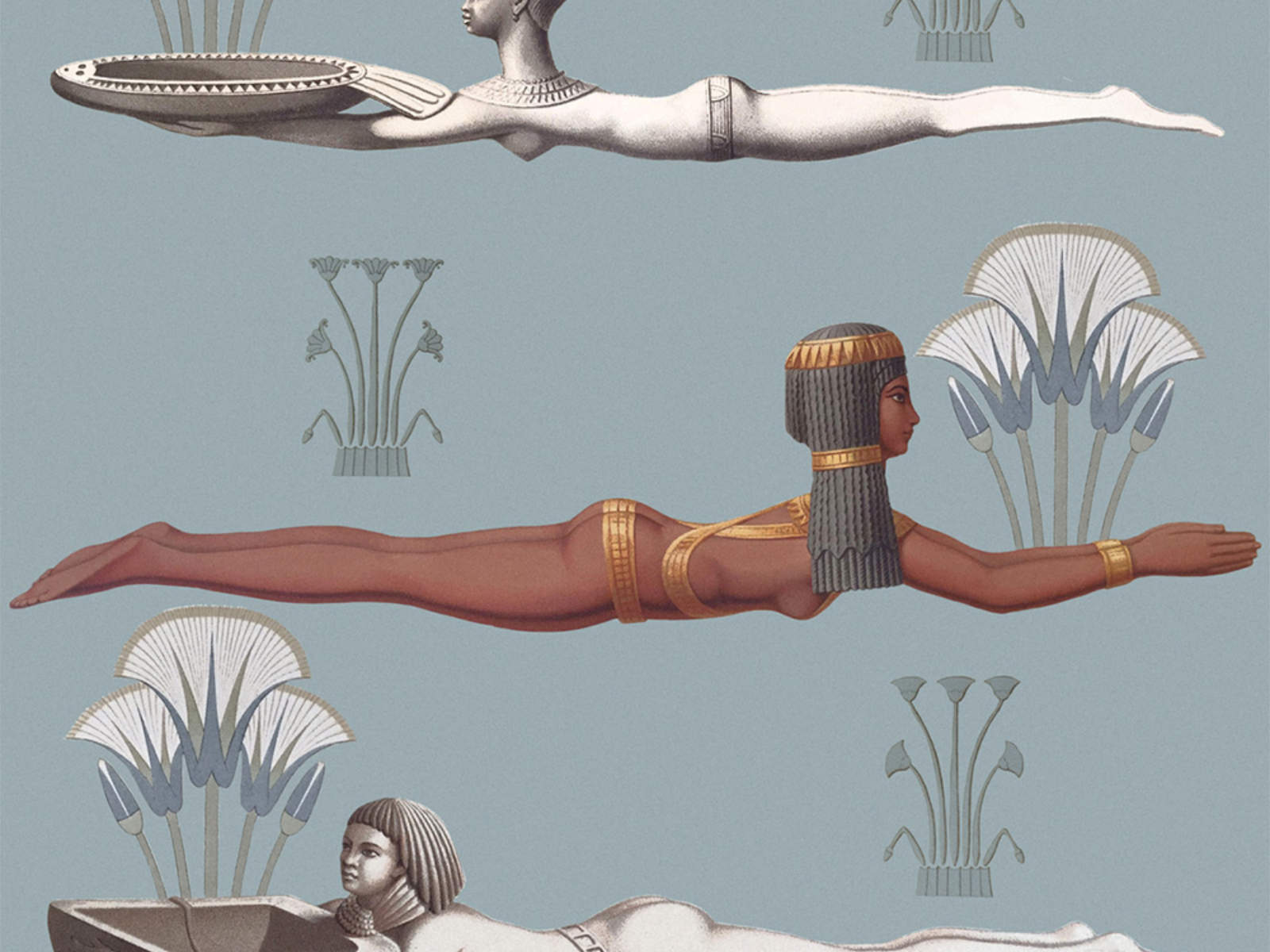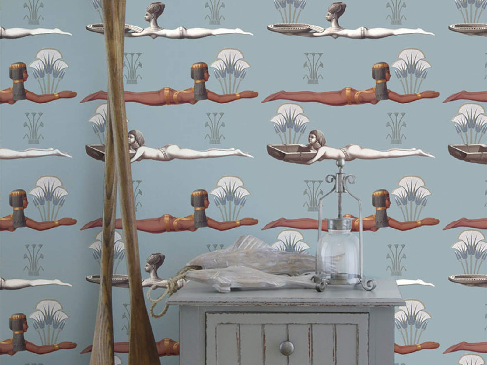 De World of Antiquity Egyptum - WP20169 van Mind The Gap behang is een prachtig behang met een decoratief dessin op een lichtblauwe achtergrond. Dit dessin is geïnspireerd door de weelde van de Egyptische cultuur.