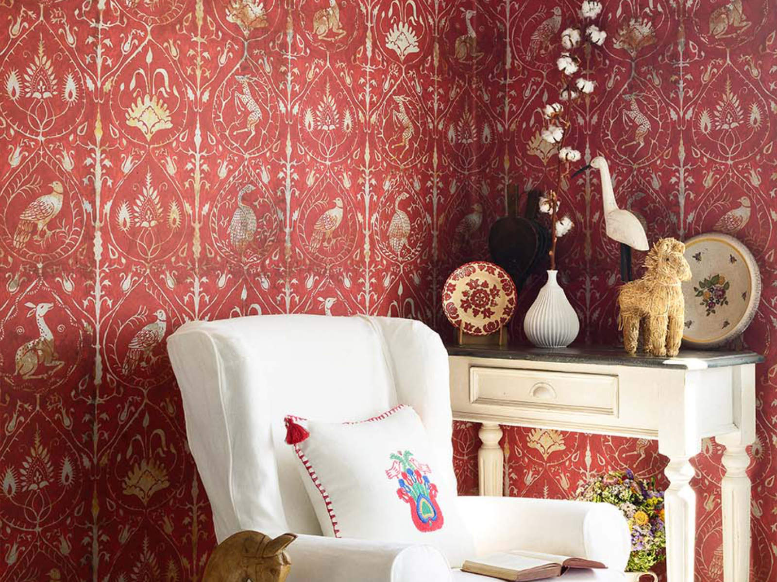 De Transylvanian Roots Hunter's Tapestry - WP20546 van Mind The Gap behang is een authentiek ontwerp uit de folklore van Transsylvanië, met rijke details en symbolen van regionale vogels en valkeniers.