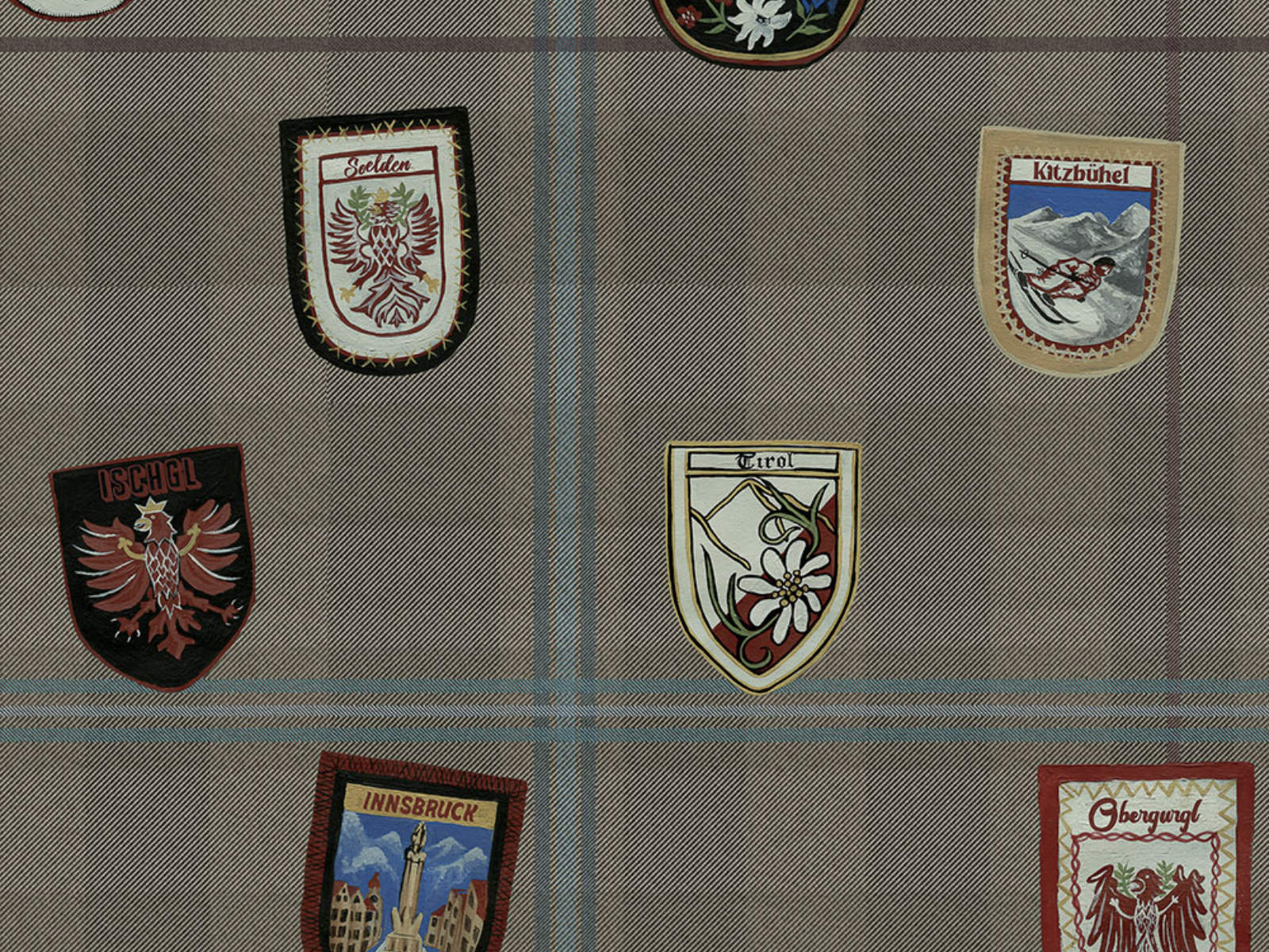 De Tyrol Alpbach Elm - WP20671 van Mind The Gap behang dit behang is vernoemd naar het bekende Oostenrijkse wintersportoord en is voorzien van vintage-stijl wapenschilden verspreid over een slimme, geruite achtergrond. De klassieke motieven zijn onder andere de Tiroler rode adelaar, die dateert uit de Middeleeuwen, en een hele reeks andere symbolen zoals mooie alpenbloemen, prachtige traditionele architectuur en natuurlijk een snelle skiër die bergafwaarts gaat. Met het Alpach behang geef je jouw kamer een warme en gezellige sfeer, perfect voor een knusse avond voor de open haard.