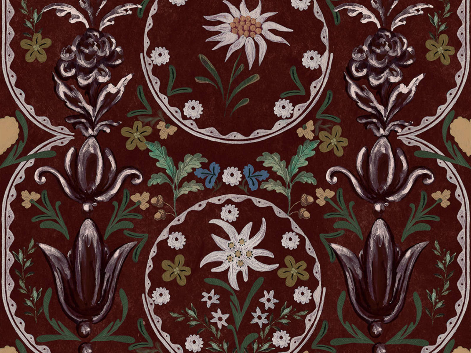 De Tyrol Edelweiss Burgundy - WP20694 van Mind The Gap behang is één van de opvallende behangontwerpen uit deze collectie. Geen enkele bloem roept meer het beeld van de bergen op dan Edelweiss, één van de florale symbolen van Tirol. De delicate stervormige bloem, lid van de familie van de madeliefjes, wordt op dit mooie behang omringd alsof het ingelijst is in een borduurring. Het patroon is verweven met eikenbladeren en omlijst door kanten randen, waardoor het een prachtig, schilderachtig effect heeft.