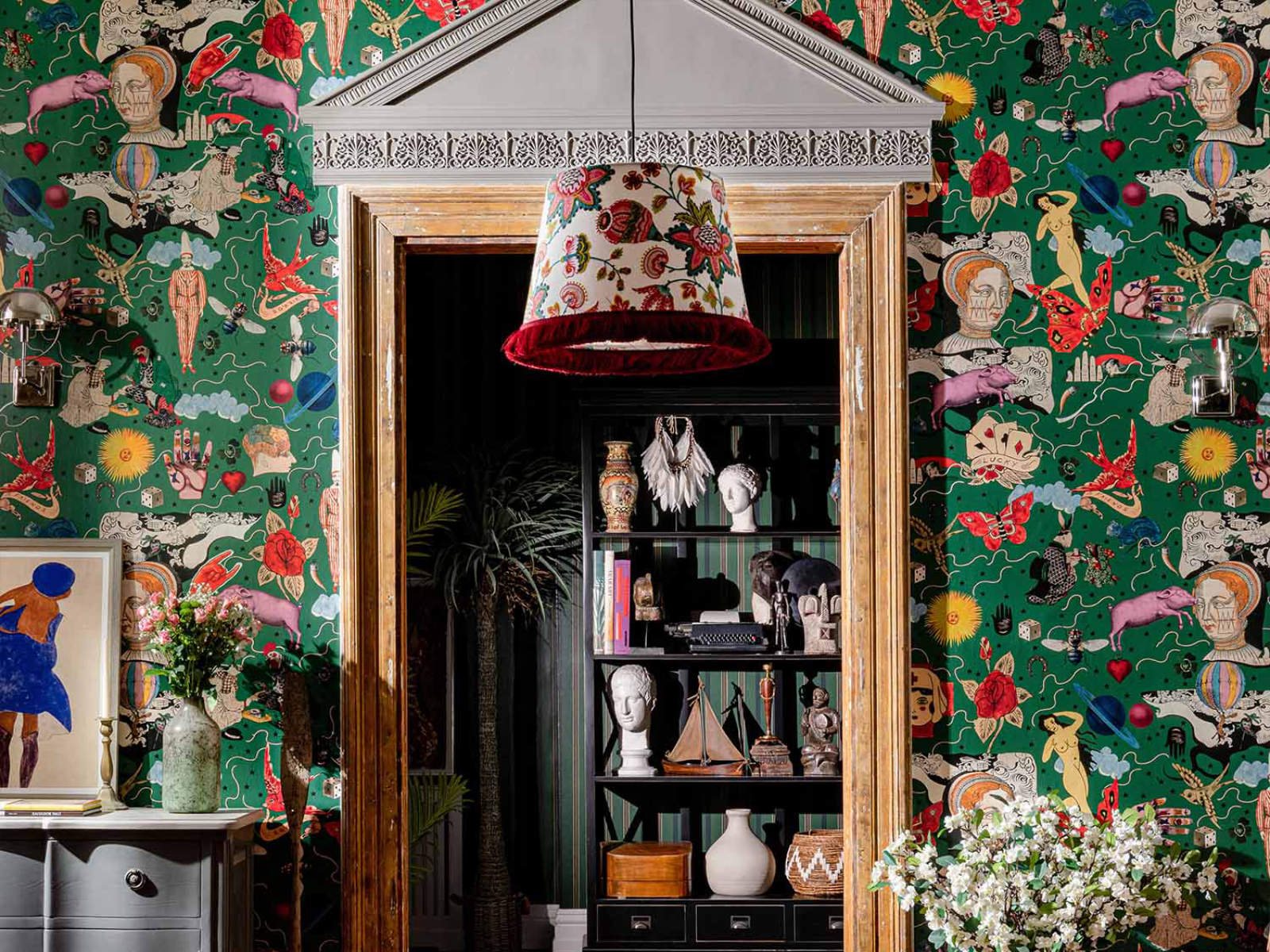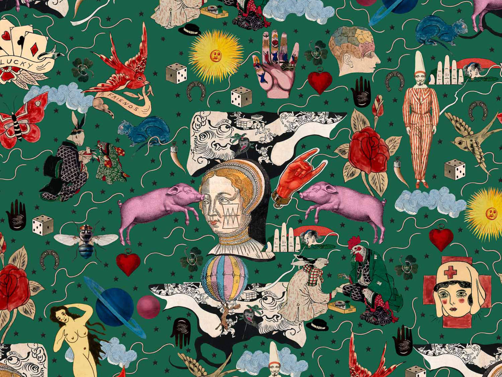 De Woodstock Illusionary Daytime Green - WP20618 van Mind The Gap behang is een portaal naar een wereld vol magie en optische illusies, waar de grenzen van de werkelijkheid vervagen. Laat je verbeelding je meenemen naar een andere dimensie, waar varkens vliegen, dieren spelletjes spelen en geluksbrengers voor het oprapen liggen. Boven de sterren, wolken en het zonnestelsel ligt de Illusianary Daytime. Een wereld waarin je kunt ontsnappen aan de werkelijkheid zoals je die kent. Een wereld waarin magie werkelijkheid is en je horizon verbreed wordt, en waarin je zintuigen overgenomen worden door de dromerige sfeer die gepaard gaat met blauwe en groene achtergronden. Met dit behang creëer je een betoverende en unieke sfeer in elke kamer van je huis.