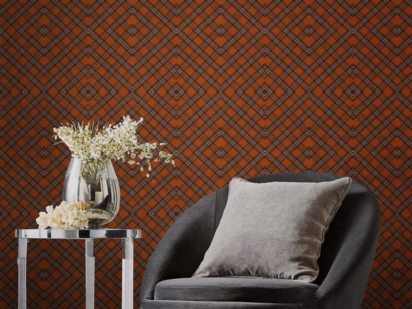 De World of Fabrics Unusual Tartan - WP20386 van Mind The Gap behang is een behang met een simpel patroon dat bestaat uit opvallende tinten bruin en zwart in een traditioneel geruit ontwerp. Dit behang geeft een rustieke en klassieke uitstraling aan je interieur.